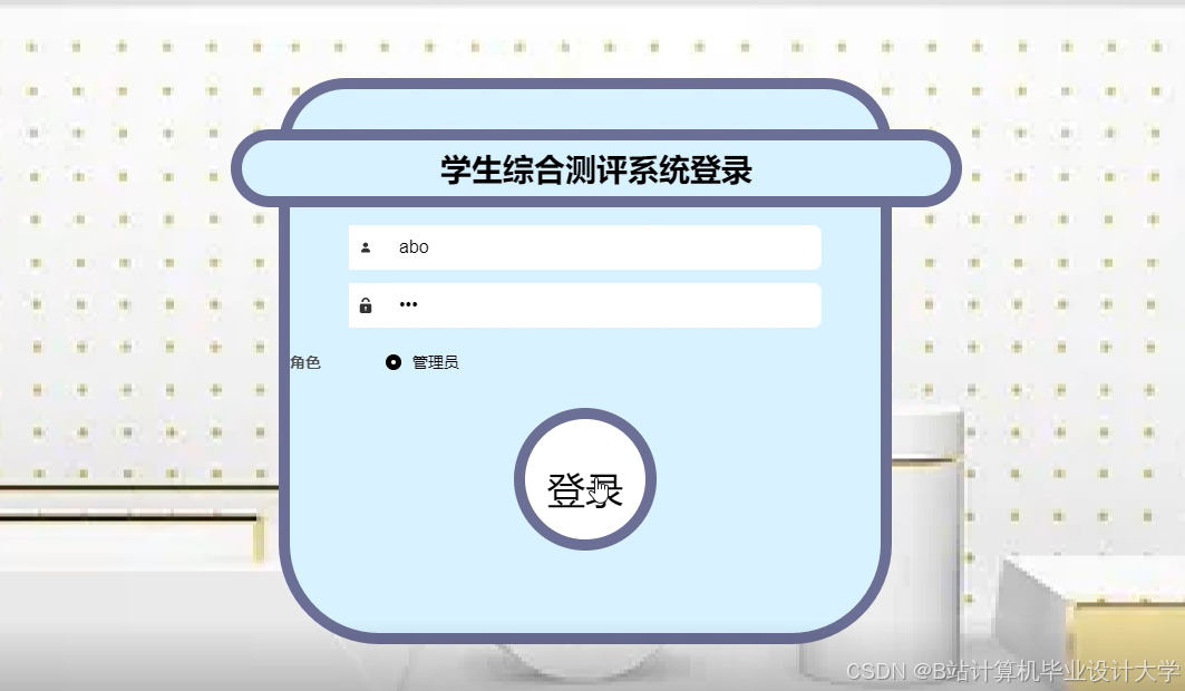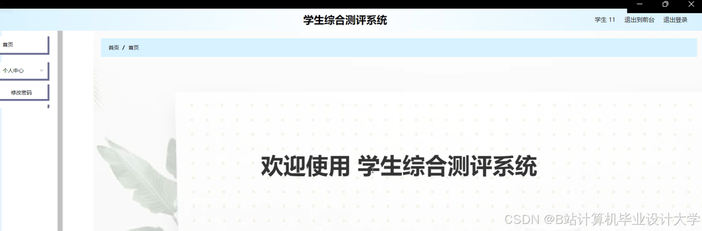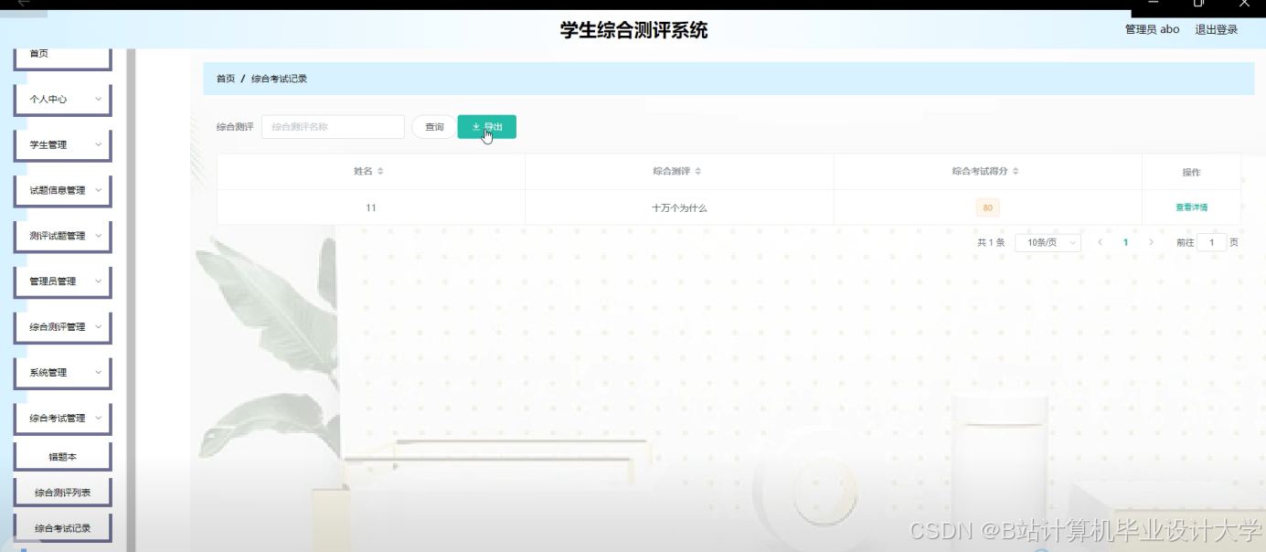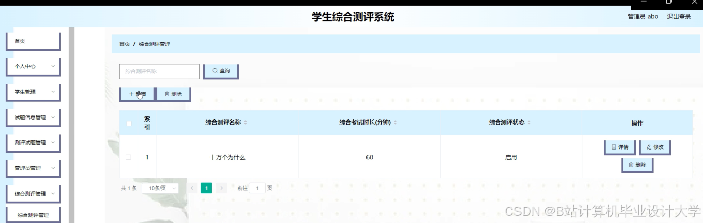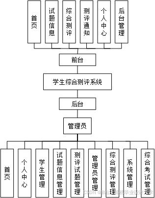 The student comprehensive evaluation system uses Springboot as the framework, B/S mode and MySql as the background database, and Tomcat as the server of the system. This system mainly includes home page, personal center, student management, test information management, assessment test management, administrator management, comprehensive assessment management, system management, comprehensive examination management and other functions, through the realization of these functions can basically meet the daily operation of comprehensive assessment management of students.