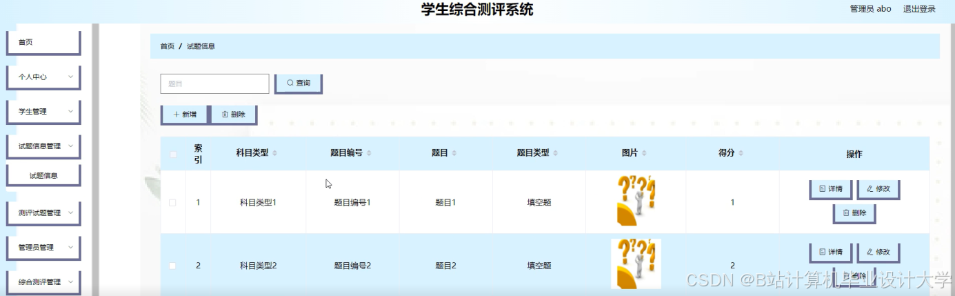 本系统提供给管理员对个人中心,学生管理,试题信息管理,测评试题管理,管理员管理,综合测评管理,系统管理,综合考试管理等诸多功能进行管理。本系统对于用户输入的任何信息都进行了一定的验证,为管理员操作提高了效率,也使其数据安全性得到了保障。