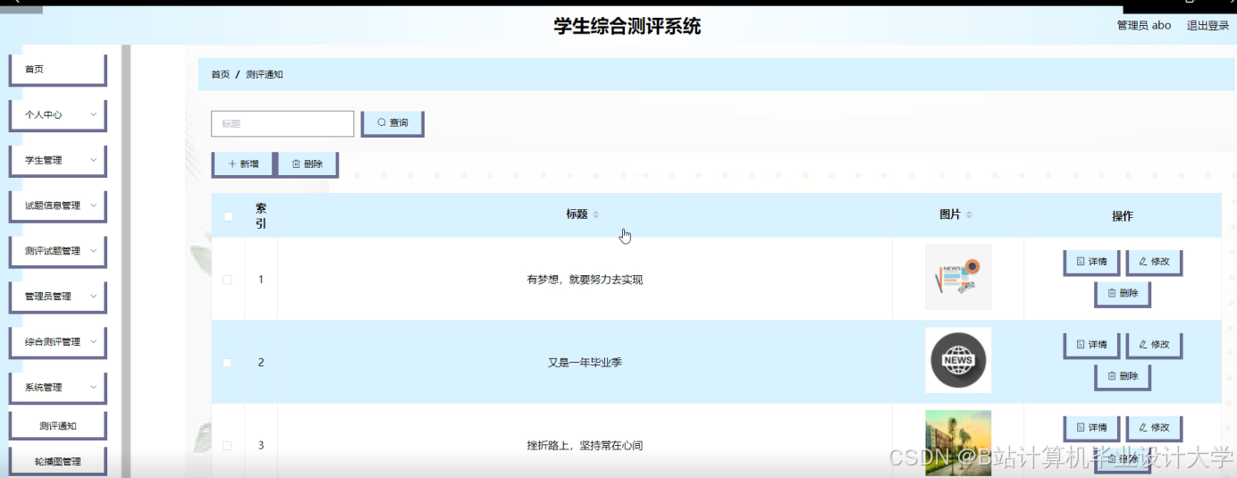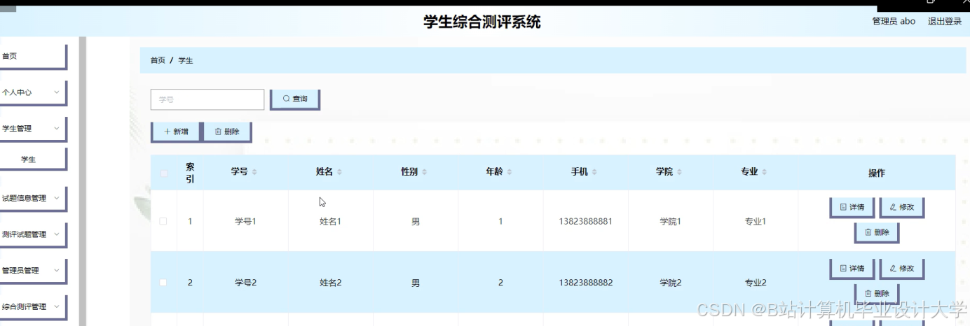 本次设计任务是要设计一个学生综合测评系统,通过这个系统能够满足学生综合测评系统的管理及学生综合测评功能。系统的主要功能包括:个人中心,学生管理,试题信息管理,测评试题管理,管理员管理,综合测评管理,系统管理,综合考试管理等功能。