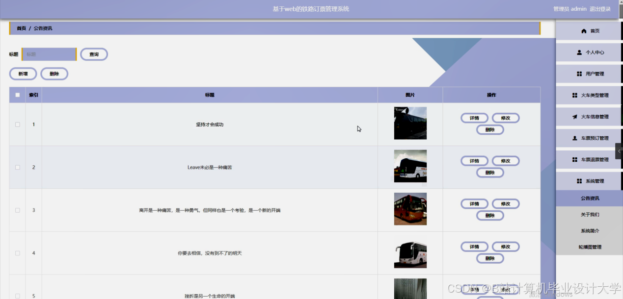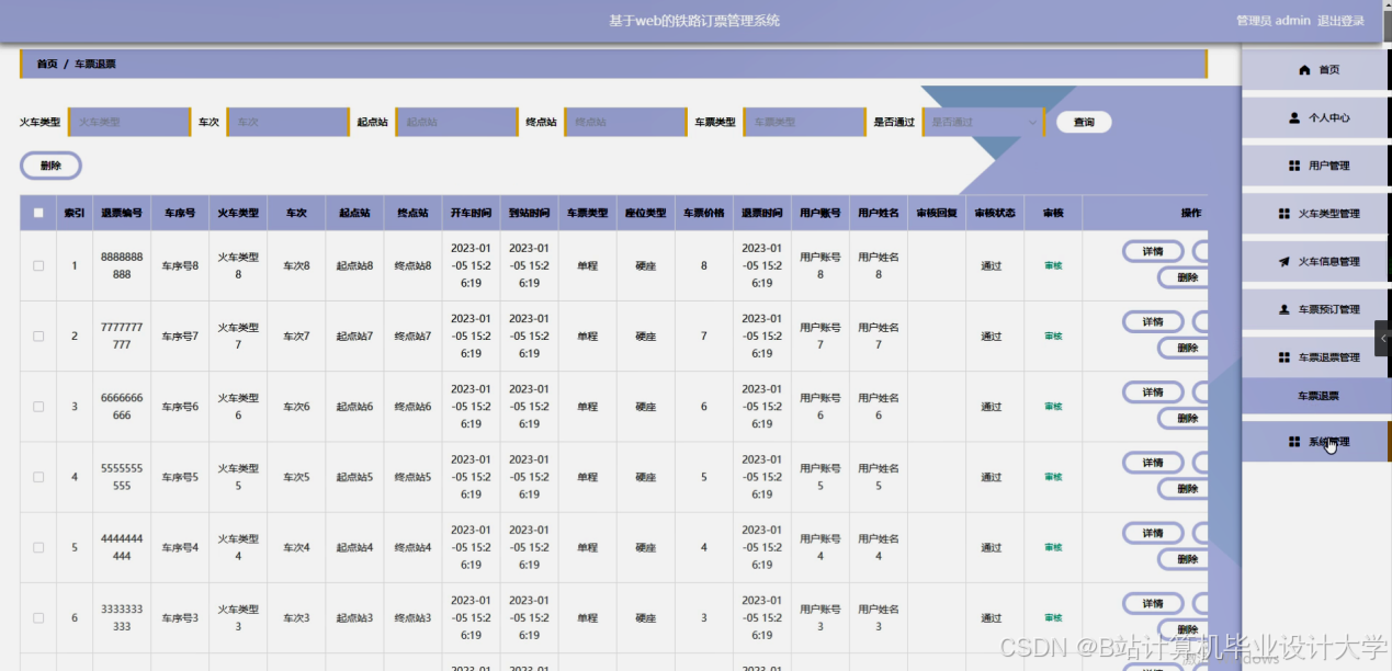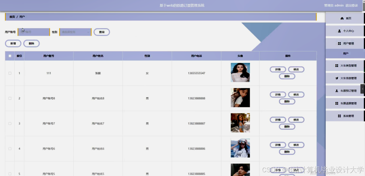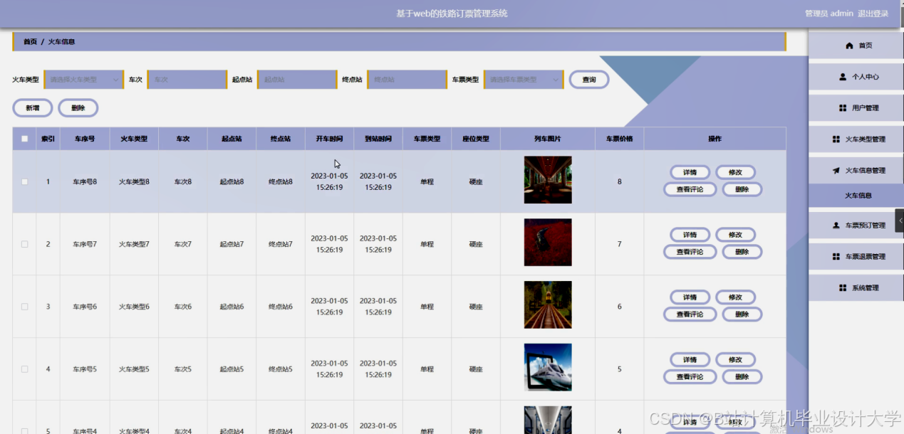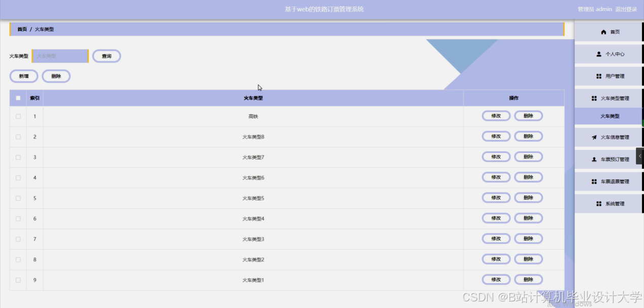 本管理系统要求管理难度低,只需要有管理员就能够对个人中心、用户管理、火车类型管理、火车信息管理、车票预订管理、车票退票管理、系统管理等信息等进行删除、修改和添加操作。