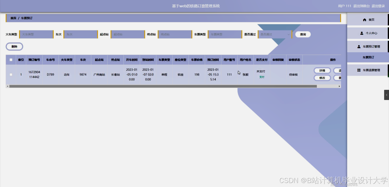 Today's society has entered a new era of scientific and technological progress and rapid economic and social development. The influence of computer technology on the development of economy and society and the improvement of people's life has also become increasingly prominent, and the way of human survival and thinking has also changed. Traditional railway booking management adopts the manual management method, but this management method has many drawbacks, such as low efficiency, low security and inaccurate information transmission, at the same time, because the railway booking management information system will form a large number of personal documents and information system data, The centralized management of railway booking information by manual method will lead to more troublesome management problems such as retrieval, modification and maintenance. Meanwhile, as the people's demand for railway booking management is rising day by day, units at all levels need to continue to carry out brand new reforms to meet the needs of The Times. According to this problem, the development of a Web-based railway booking management system can not only greatly improve the efficiency of information retrieval, change and maintenance, but also facilitate the management and application of information system, so as to reduce the cost of information management and improve efficiency.