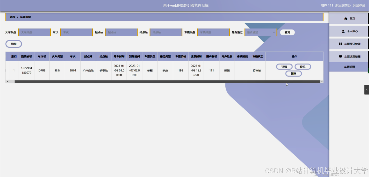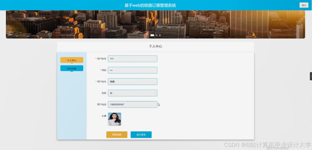 - 用户可以进入系统进行个人信息修改,对车票预订管理、车票退票管理等进行操作。