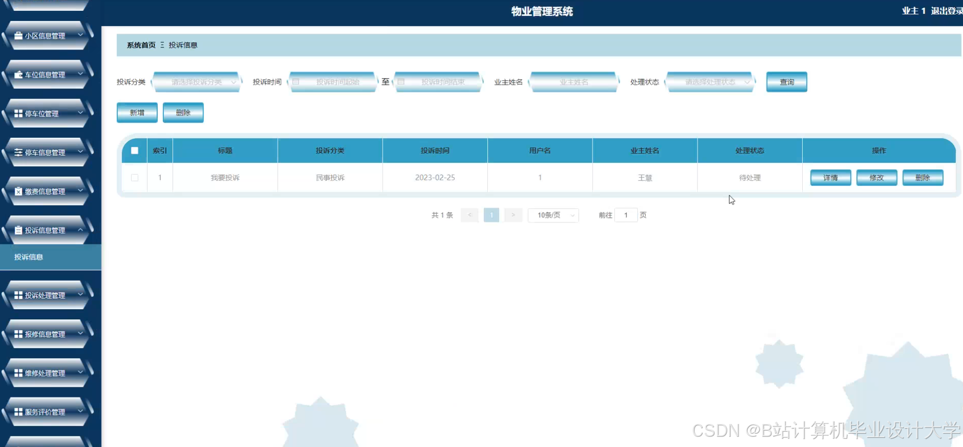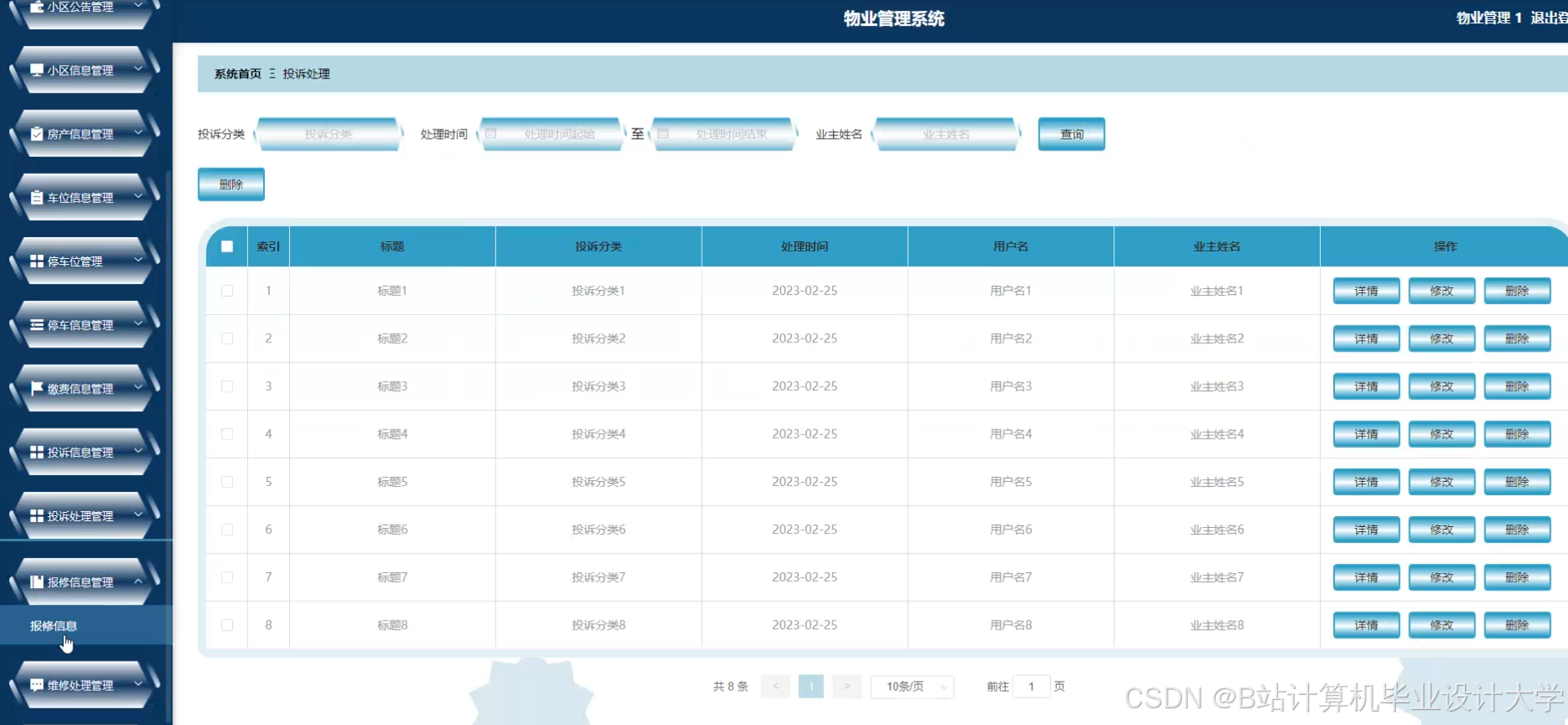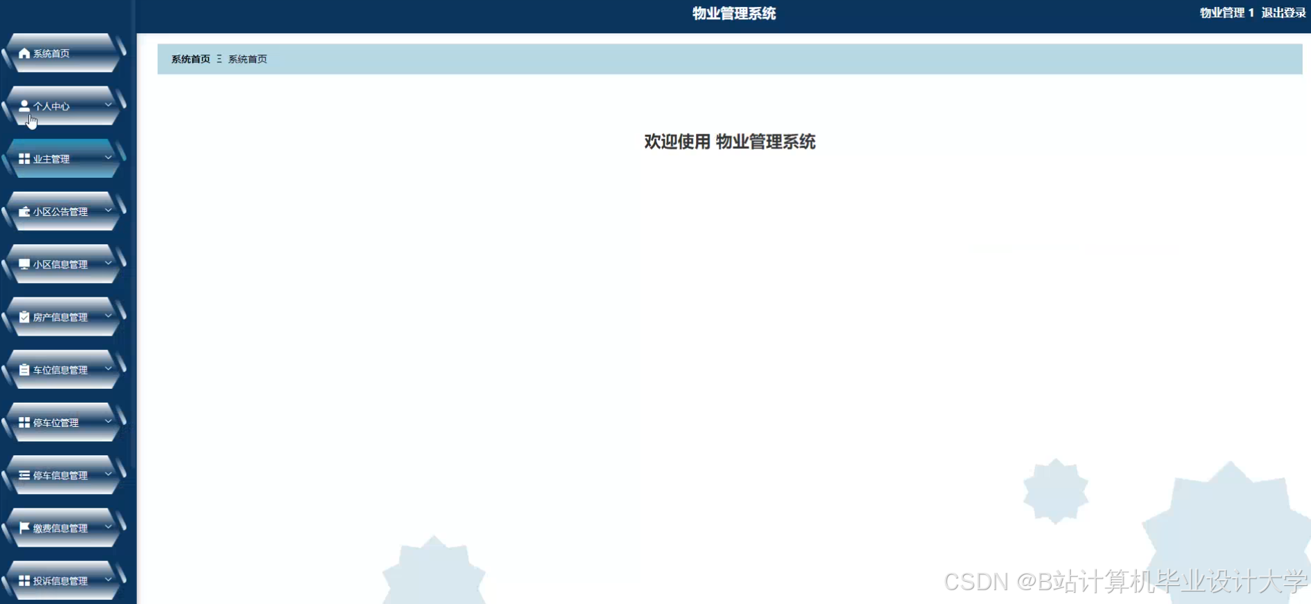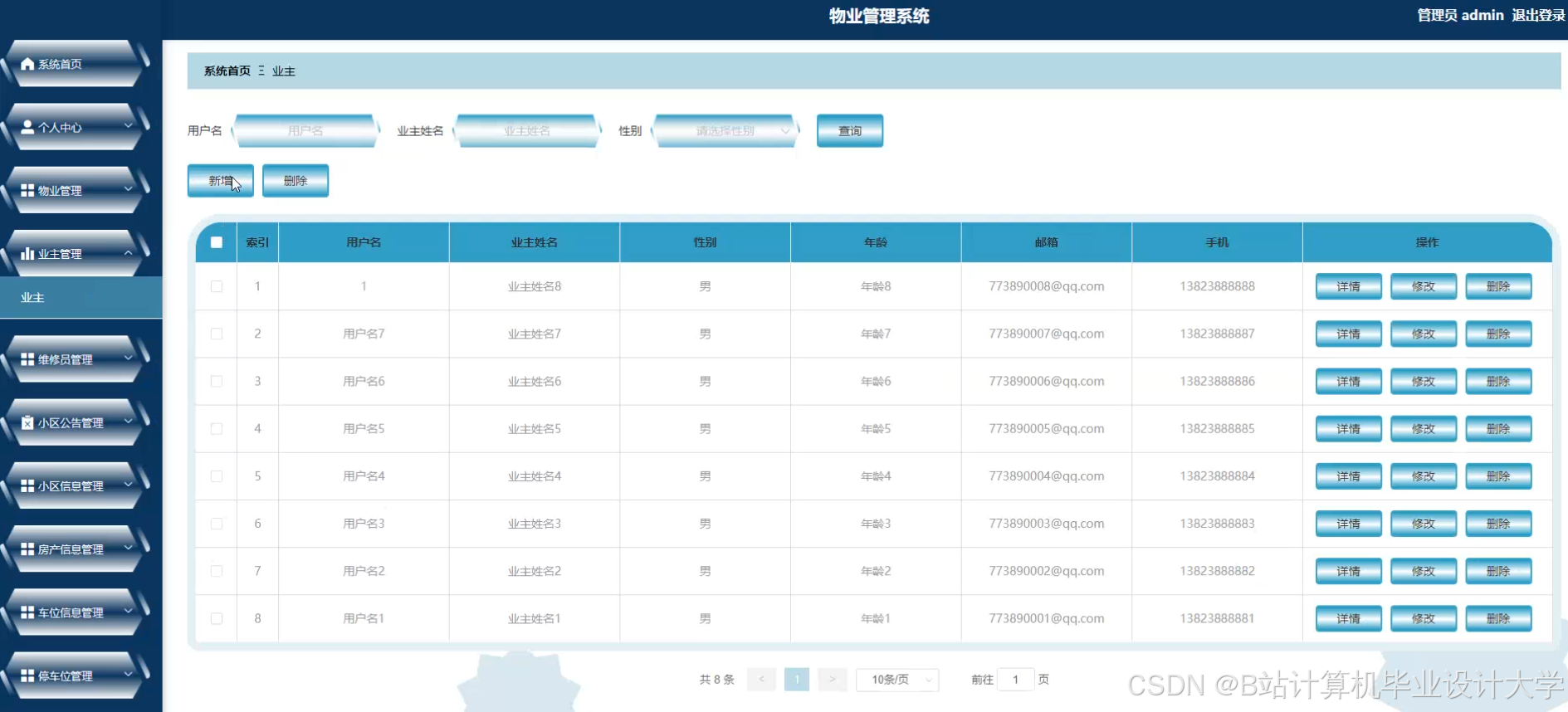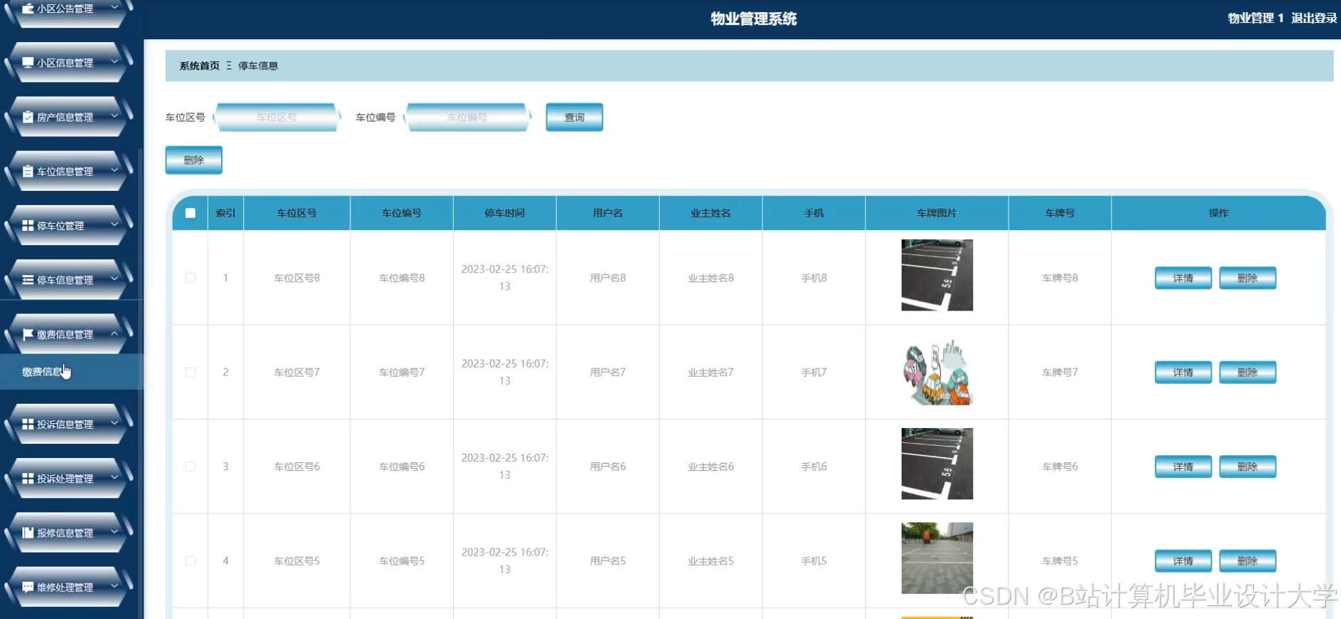The topic is mainly divided into four modules: administrator module, property management module, owner module and maintenance module. The main functions include: Personal center part, property management, the owner management, maintenance management, community management, community information management, real estate information management, information management, management of parking Spaces parking Spaces, parking information management, capture expends complain information management, classification management, information management, complaint handling, service information management and maintenance of process management, service evaluation management, information management, etc.