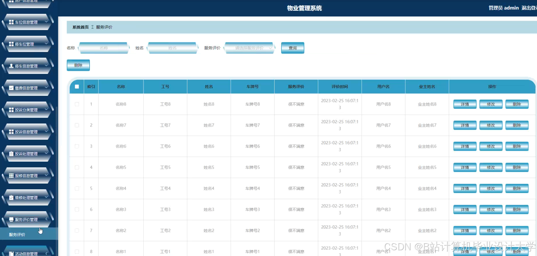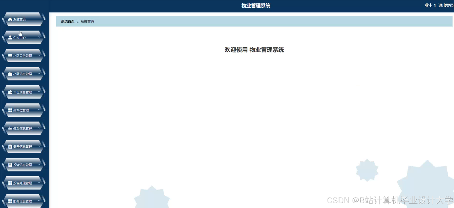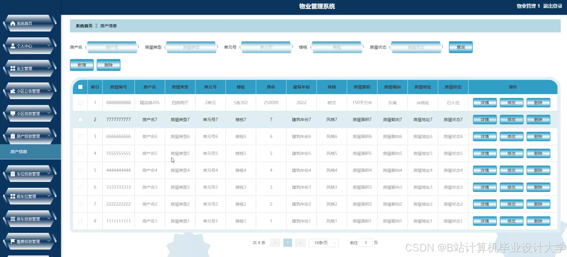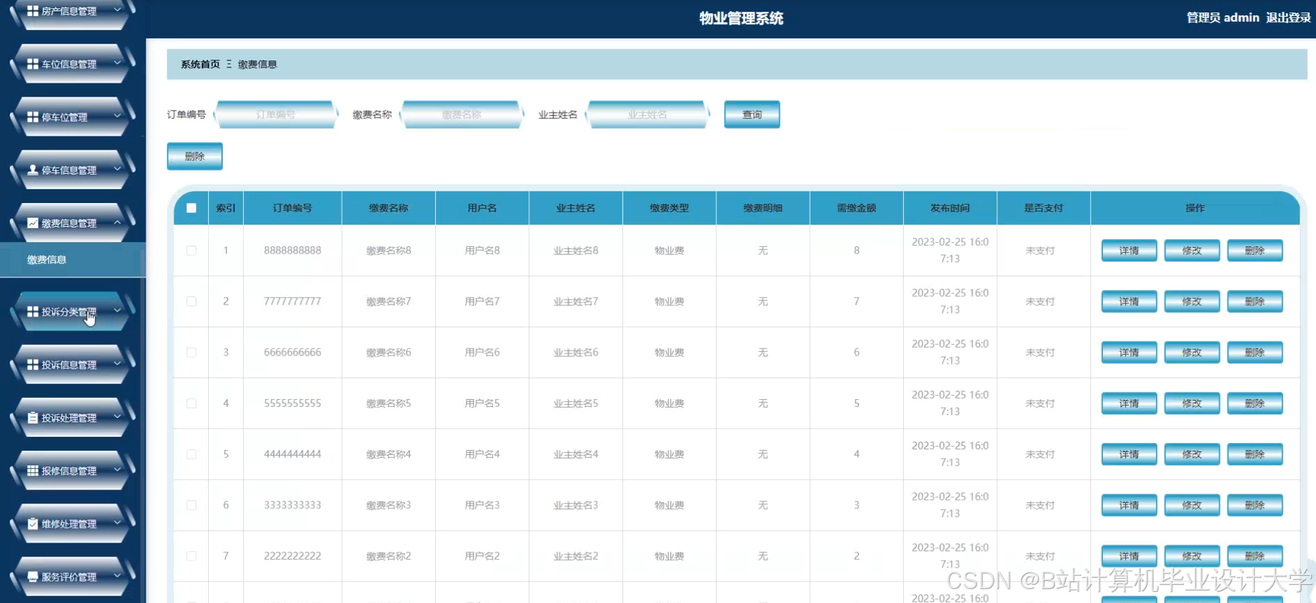 The topic is mainly divided into four modules: administrator module, property management module, owner module and maintenance module. The main functions include: Personal center part, property management, the owner management, maintenance management, community management, community information management, real estate information management, information management, management of parking Spaces parking Spaces, parking information management, capture expends complain information management, classification management, information management, complaint handling, service information management and maintenance of process management, service evaluation management, information management, etc.