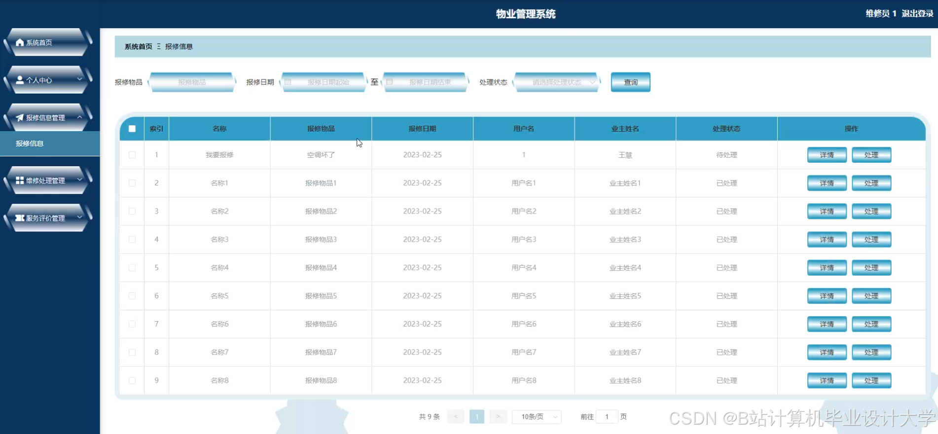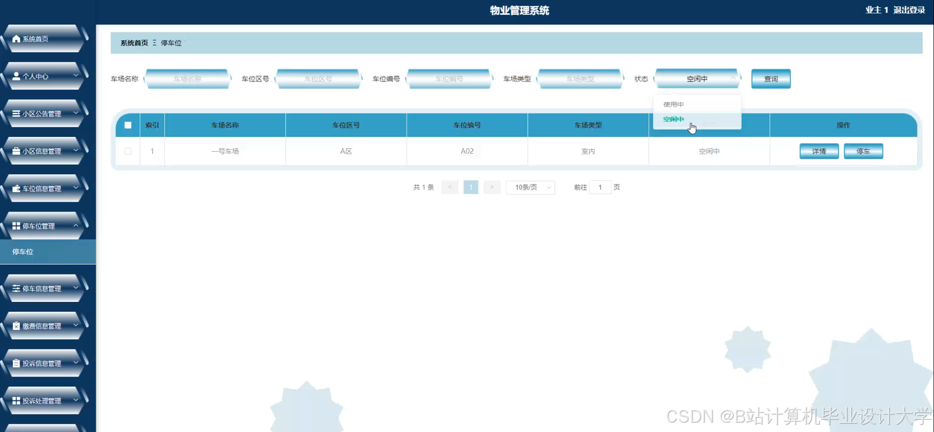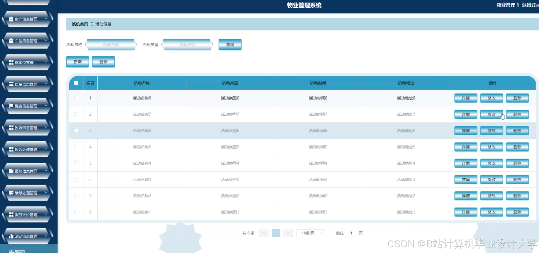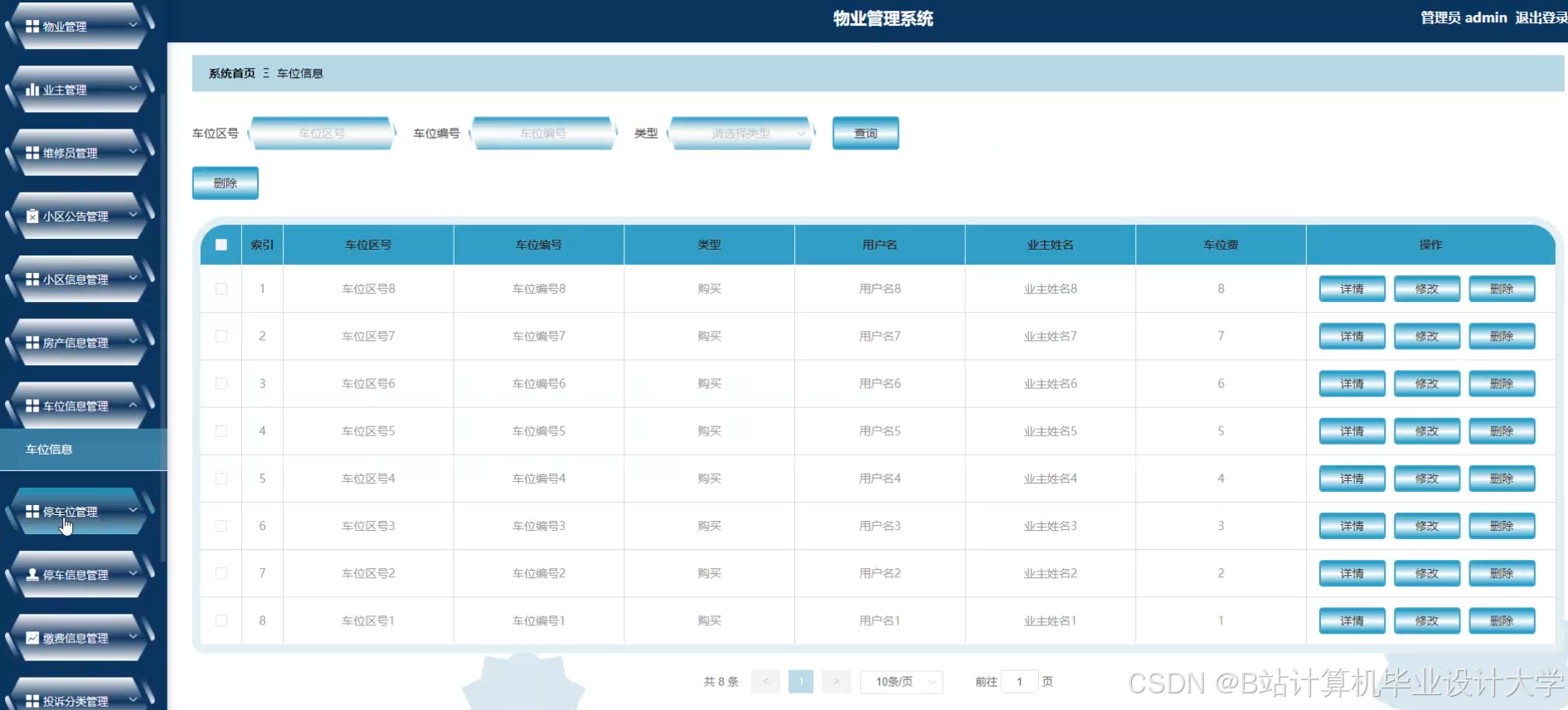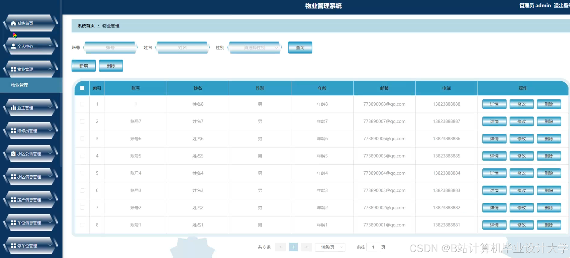 The topic is mainly divided into four modules: administrator module, property management module, owner module and maintenance module. The main functions include: Personal center part, property management, the owner management, maintenance management, community management, community information management, real estate information management, information management, management of parking Spaces parking Spaces, parking information management, capture expends complain information management, classification management, information management, complaint handling, service information management and maintenance of process management, service evaluation management, information management, etc.