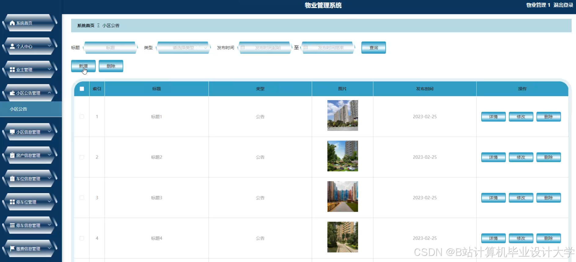 第五章主要是将物业管理系统主要为后台管理界面以及各部分相关功能页面。