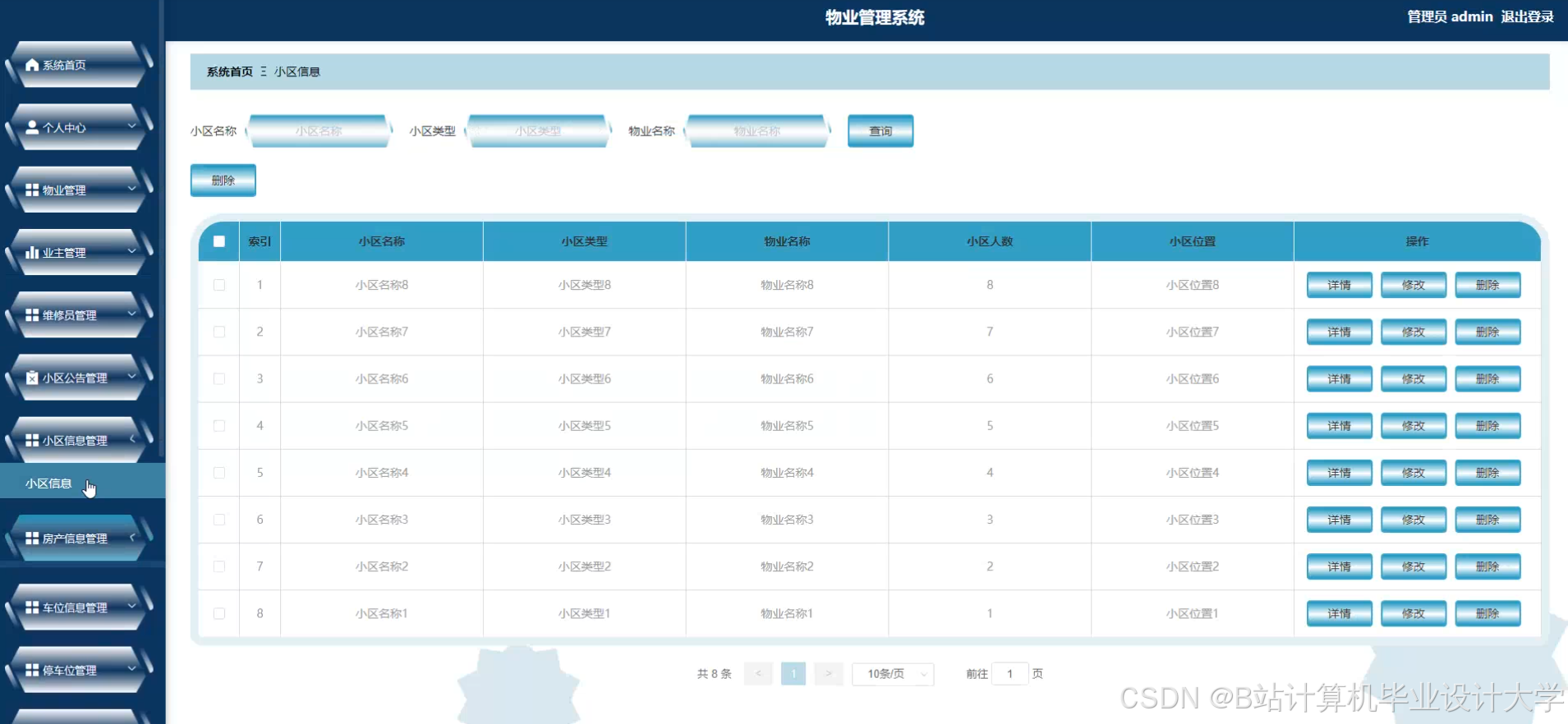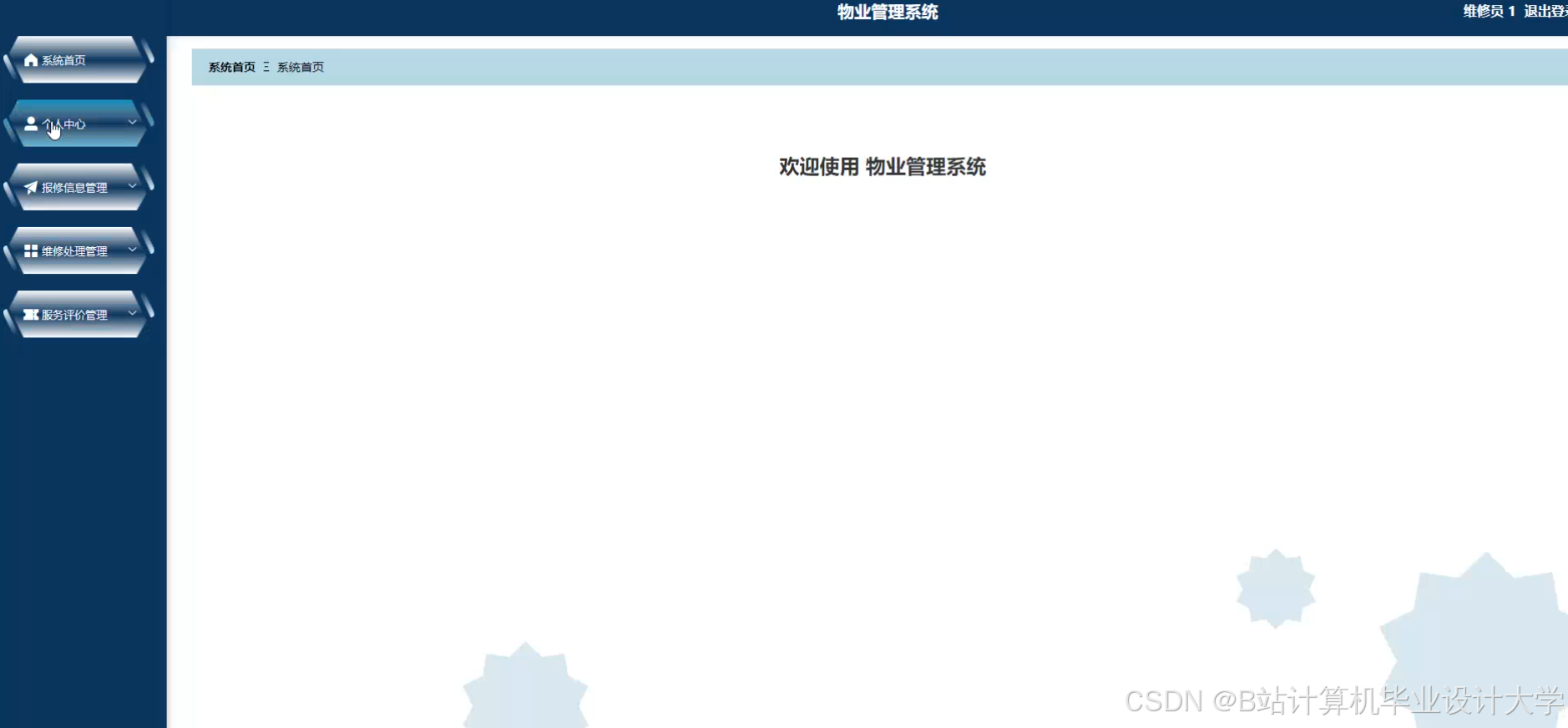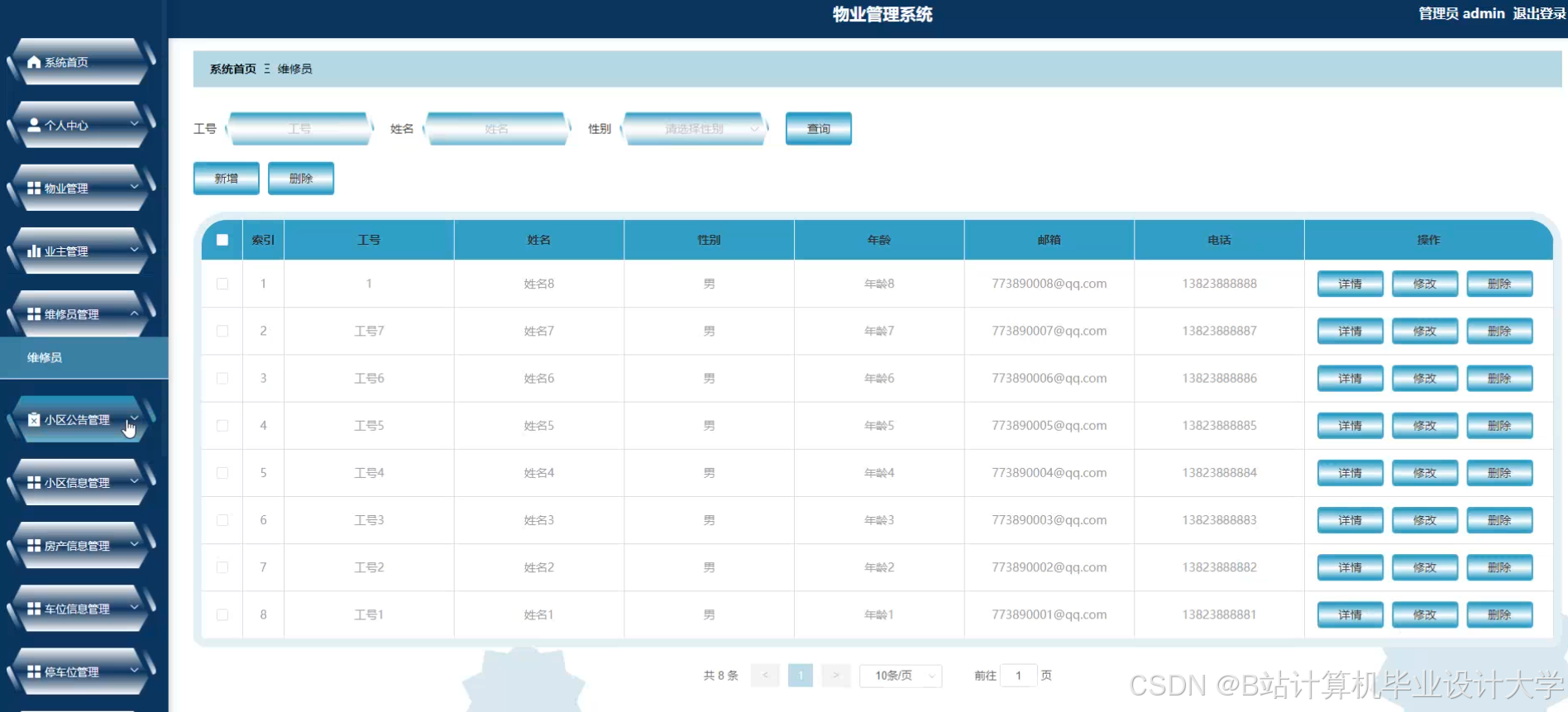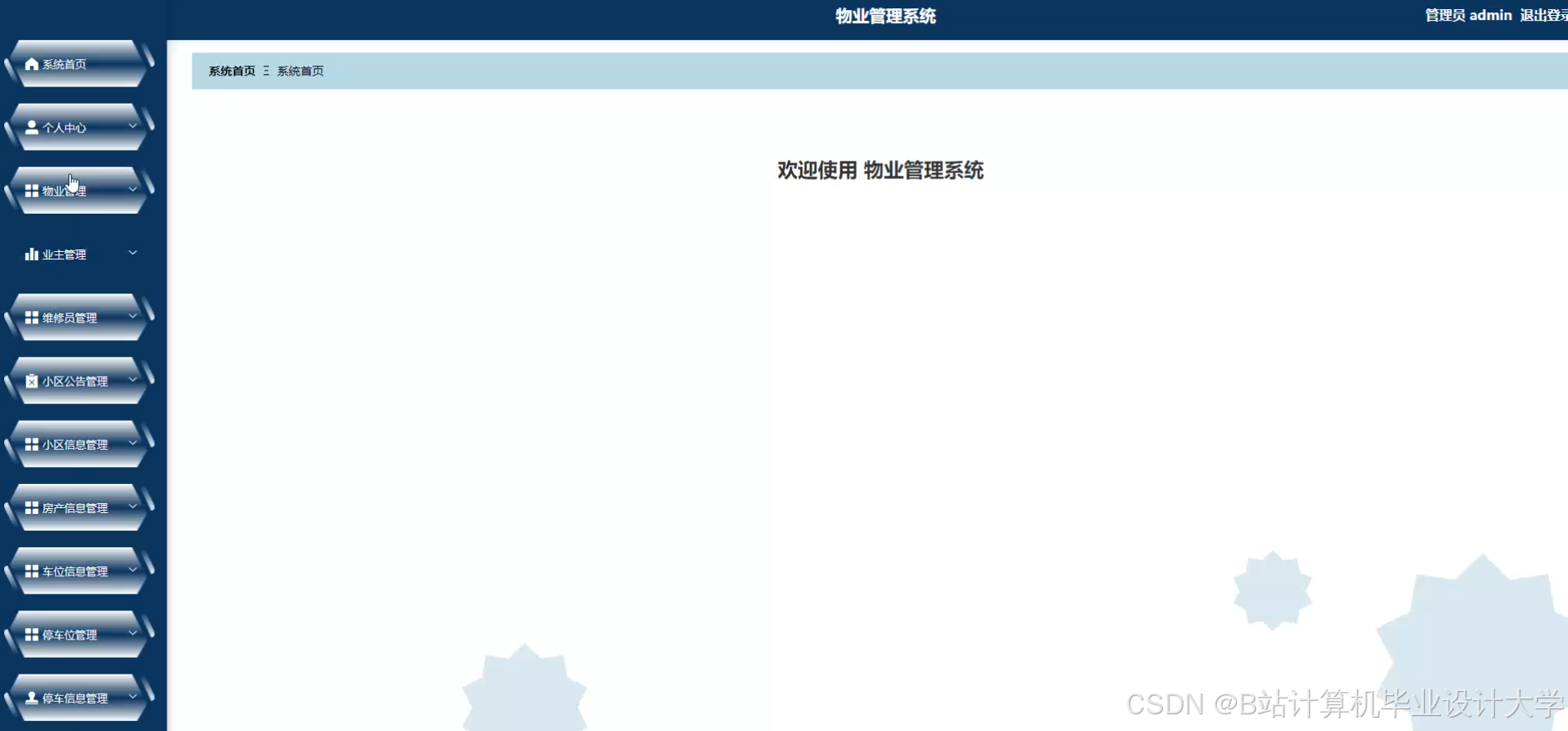 后台管理页面:分别是管理员、物业管理、业主和维修员登录本系统。管理员输入管理员账号密码后,校验无误后方可进入后台管理主界面,对物业管理、业主和维修员使用的权限管理,设置小区公告等管理以及对活动信息进行管理[9]。