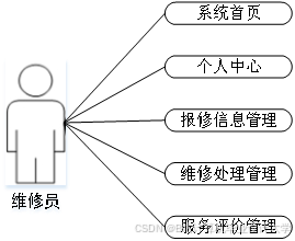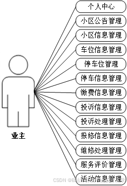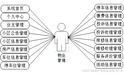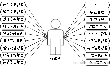 管理员用例图依据管理员的权限需求以及对系统的管理需求进行分析,主要包括了个人中心、物业管理、业主管理、维修员管理、小区公告管理、小区信息管理、房产信息管理、车位信息管理、停车位管理、停车信息管理、缴费信息管理、投诉分类管理、投诉信息管理、投诉处理管理、报修信息管理、维修处理管理、服务评价管理、活动信息管理等