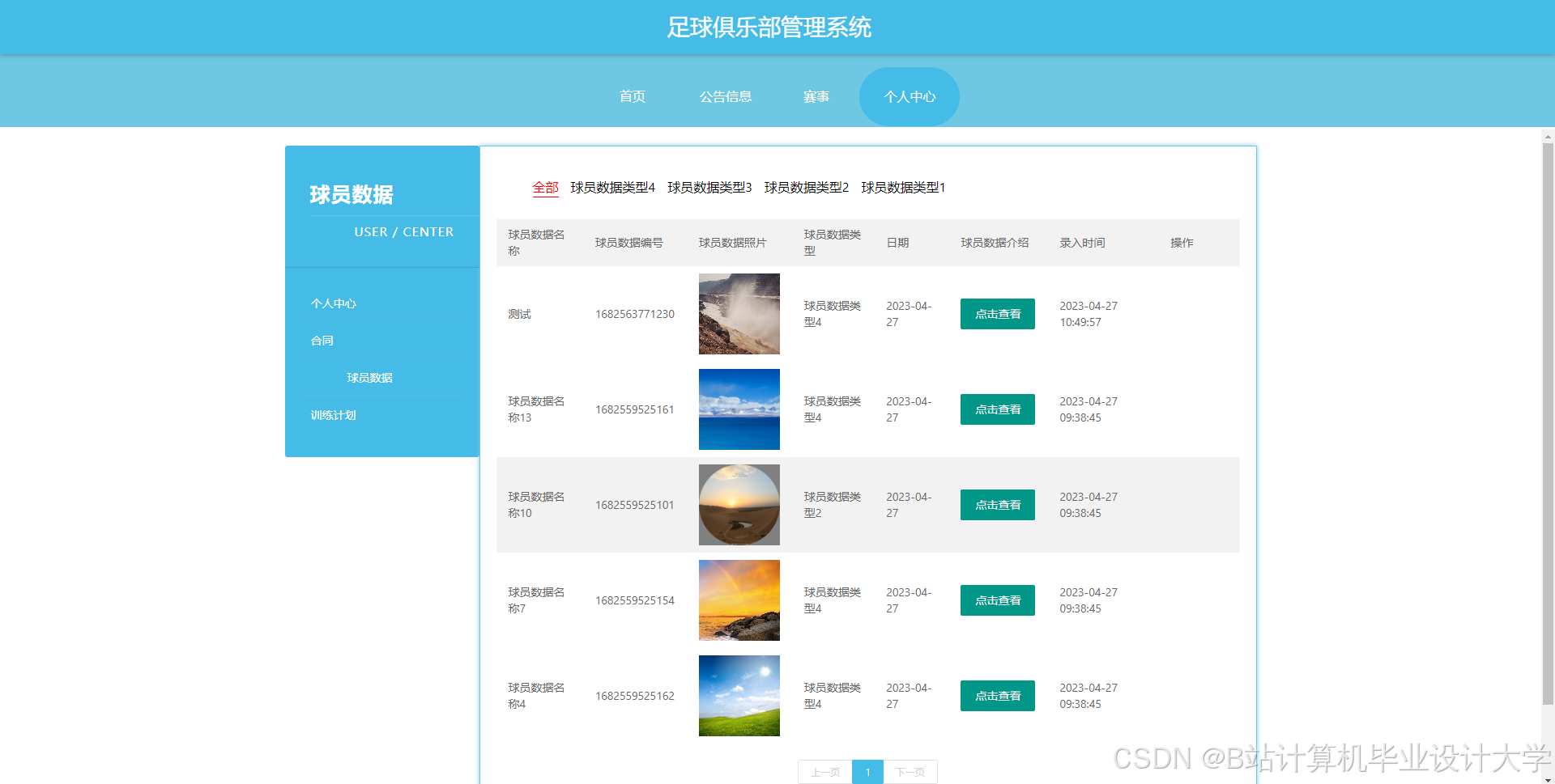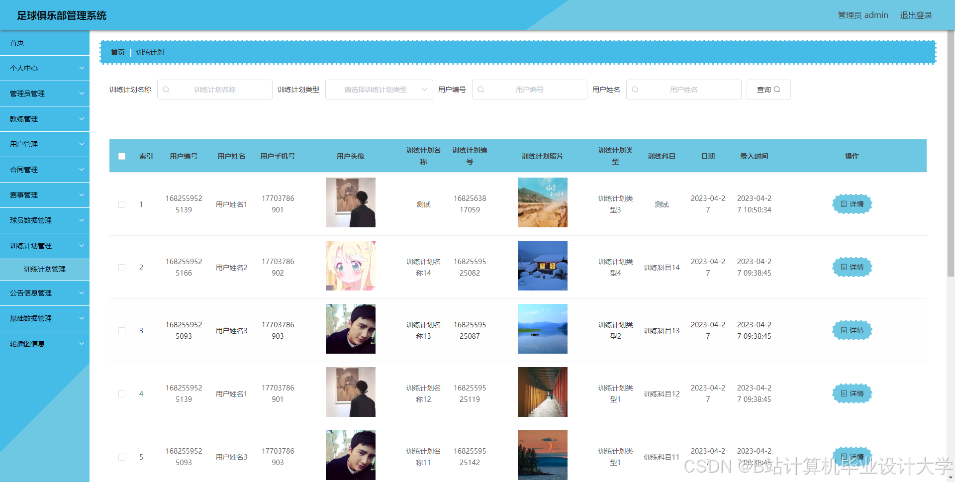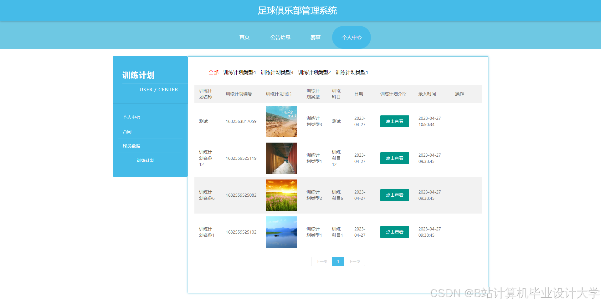 足球俱乐部管理系统管理系统按照操作主体分为管理员和用户。管理员的功能包括字典管理、公告信息管理、合同管理、教练管理、赛事管理、球员数据管理、训练计划管理、用户管理、管理员管理。用户的功能等。该系统采用了Mysql数据库,Java语言,Spring Boot框架等技术进行编程实现。
