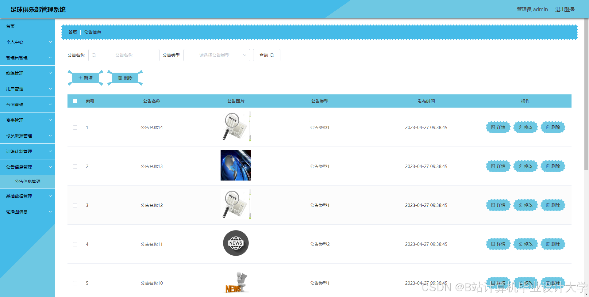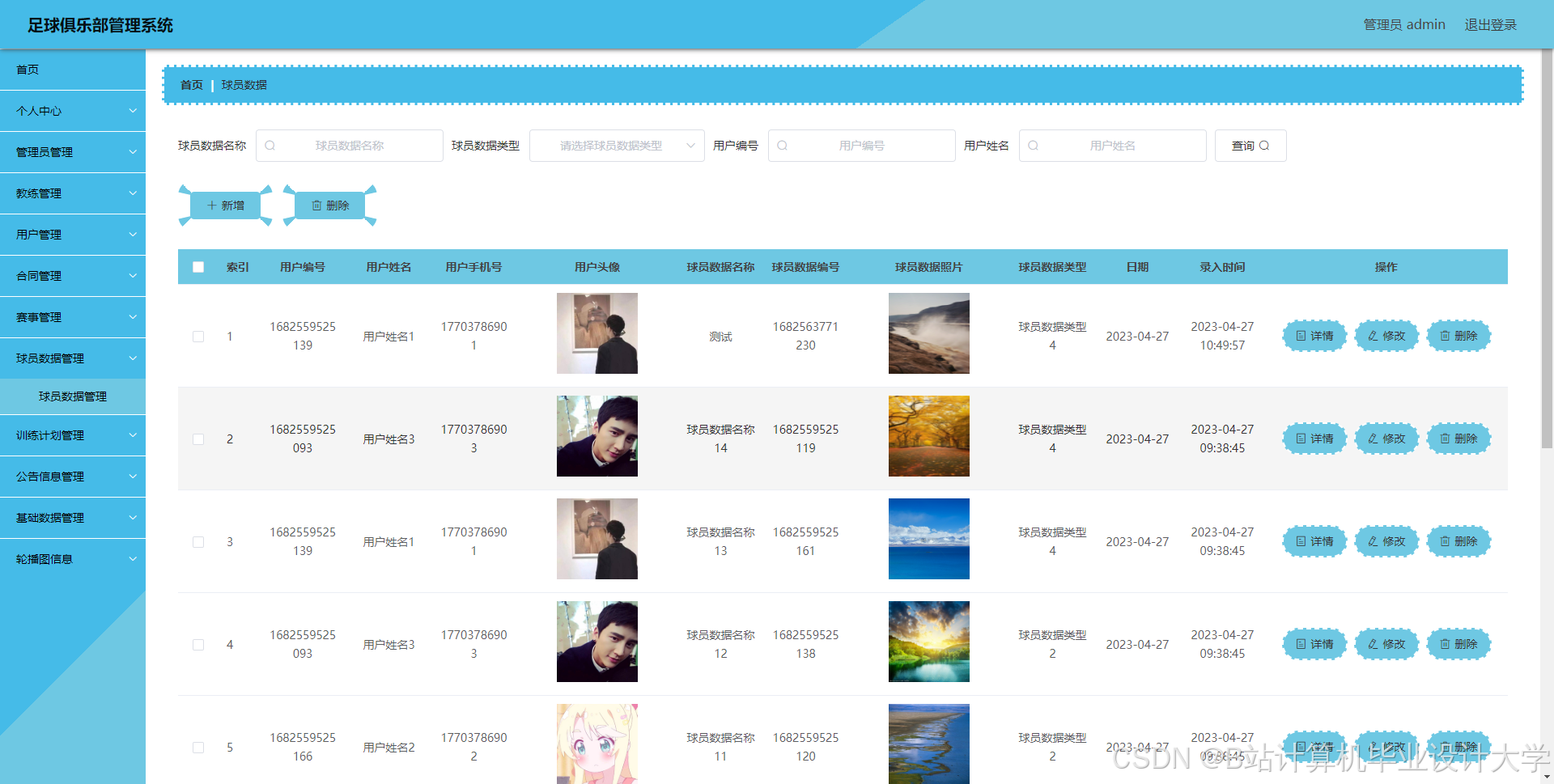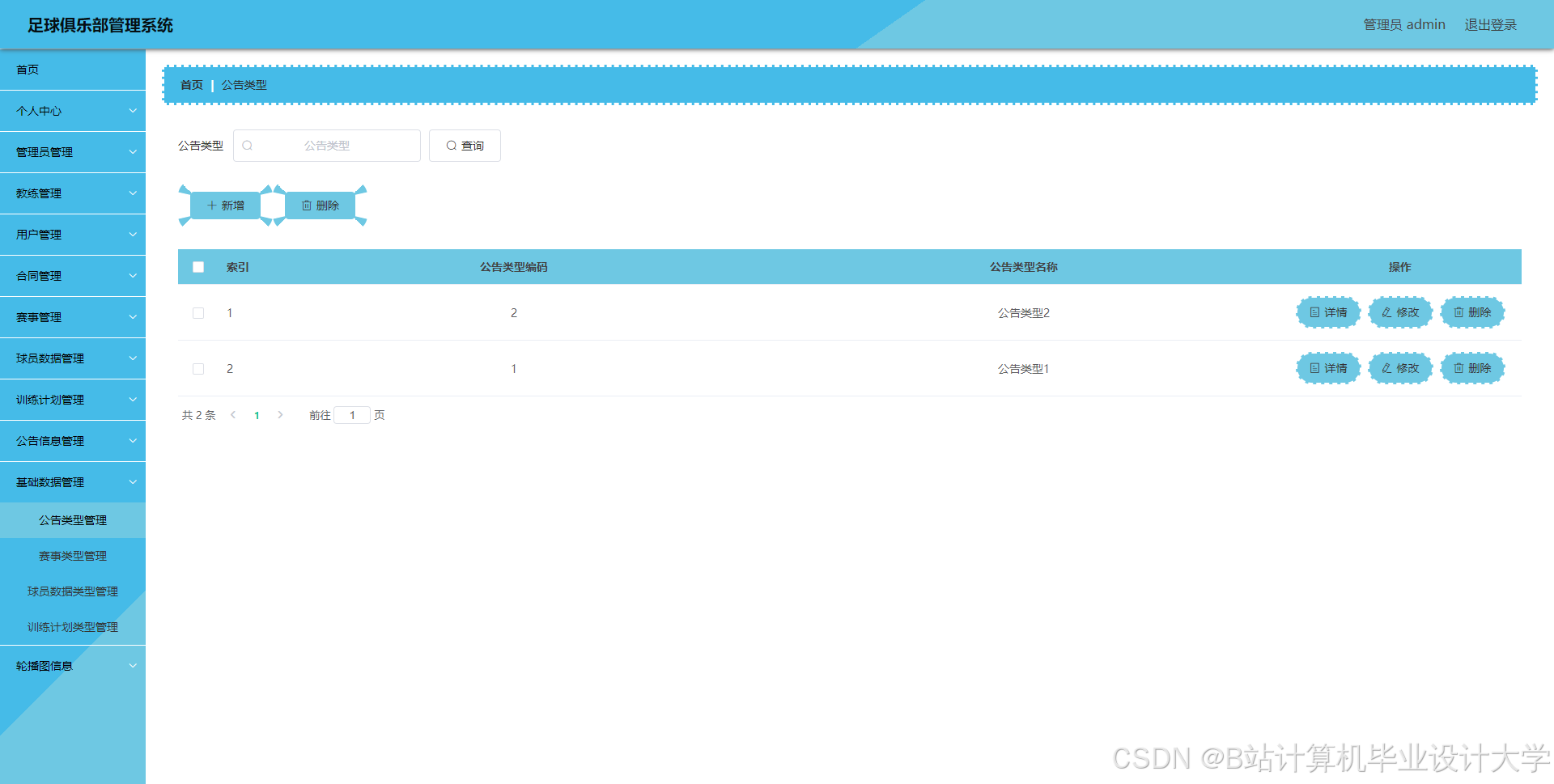 足球俱乐部管理系统管理系统按照操作主体分为管理员和用户。管理员的功能包括字典管理、公告信息管理、合同管理、教练管理、赛事管理、球员数据管理、训练计划管理、用户管理、管理员管理。用户的功能等。该系统采用了Mysql数据库,Java语言,Spring Boot框架等技术进行编程实现。