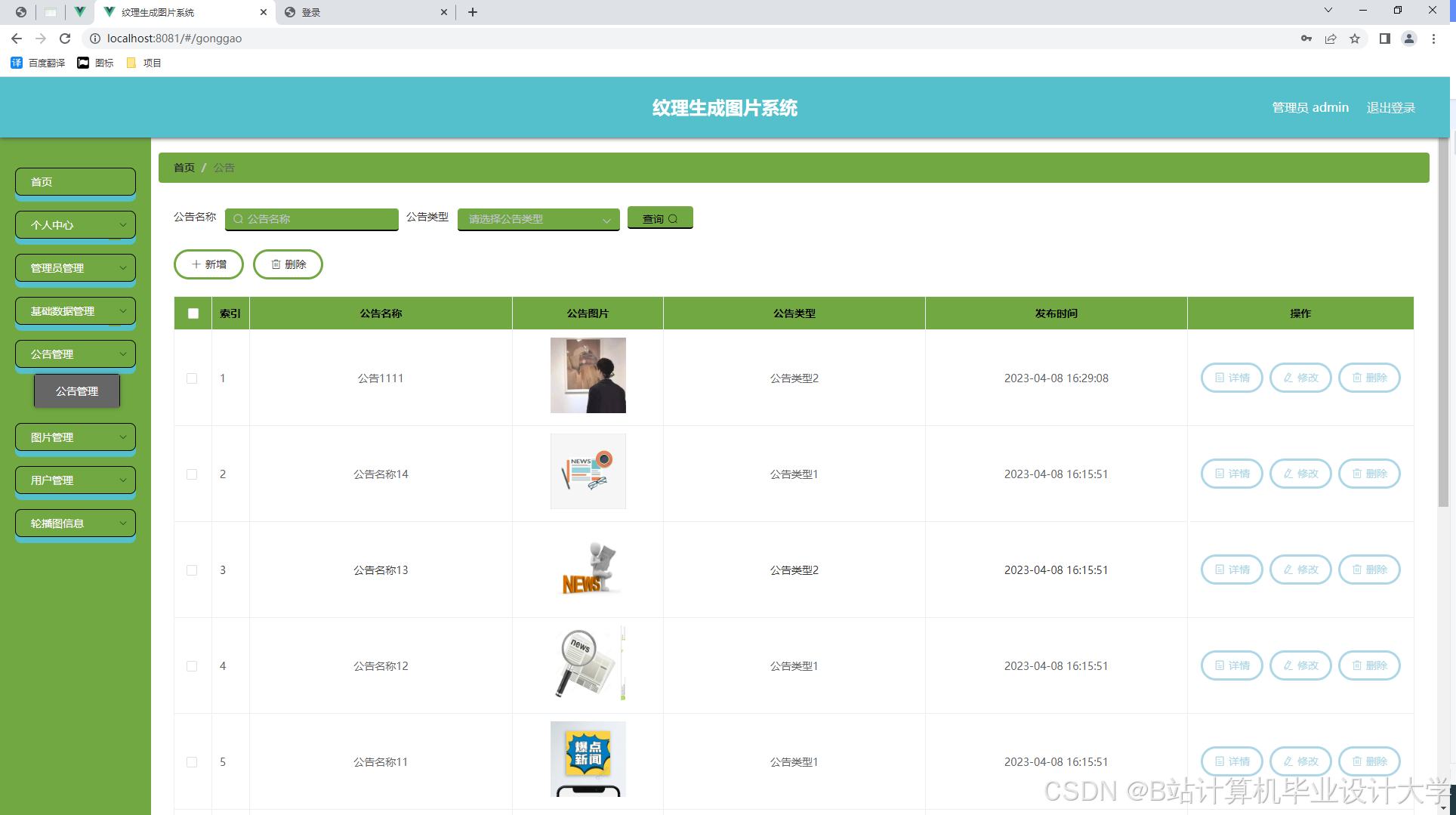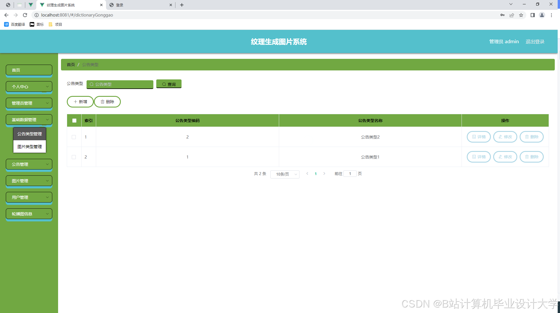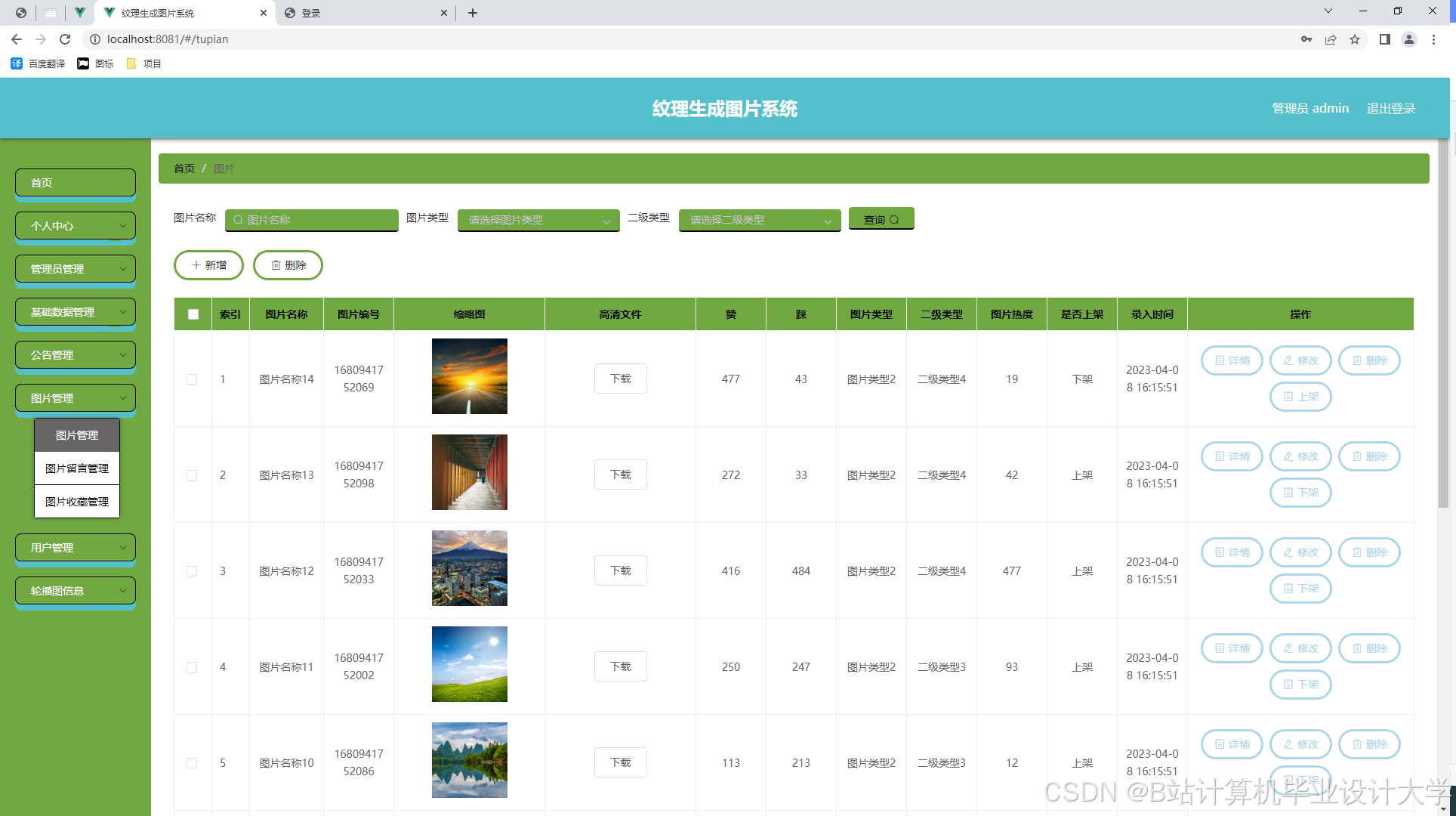信息数据从传统到当代,是一直在变革当中,突如其来的互联网让传统的信息管理看到了革命性的曙光,因为传统信息管理从时效性,还是安全性,还是可操作性等各个方面来讲,遇到了互联网时代才发现能补上自古以来的短板,有效的提升管理的效率和业务水平。传统的管理模式,时间越久管理的内容越多,也需要更多的人来对数据进行整理,并且数据的汇总查询方面效率也是极其的低下,并且数据安全方面永远不会保证安全性能。结合数据内容管理的种种缺点,在互联网时代都可以得到有效的补充。结合先进的互联网技术,开发符合需求的软件,让数据内容管理不管是从录入的及时性,查看的及时性还是汇总分析的及时性,都能让正确率达到最高,管理更加的科学和便捷。本次开发的纹理生成图片系统实现了字典管理、公告管理、图片管理、图片收藏管理、图片留言管理、用户管理、管理员管理等功能。系统用到了关系型数据库中王者MySQL作为系统的数据库,有效的对数据进行安全的存储,有效的备份,对数据可靠性方面得到了保证。并且程序也具备程序需求的所有功能,使得操作性还是安全性都大大提高,让纹理生成图片系统更能从理念走到现实,确确实实的让人们提升信息处理效率。