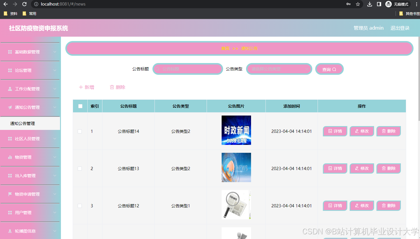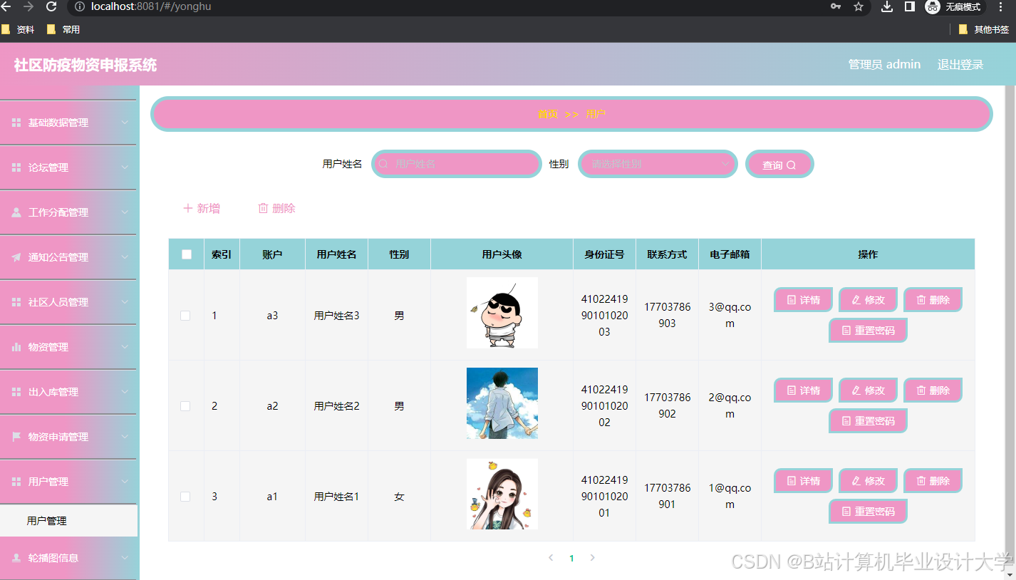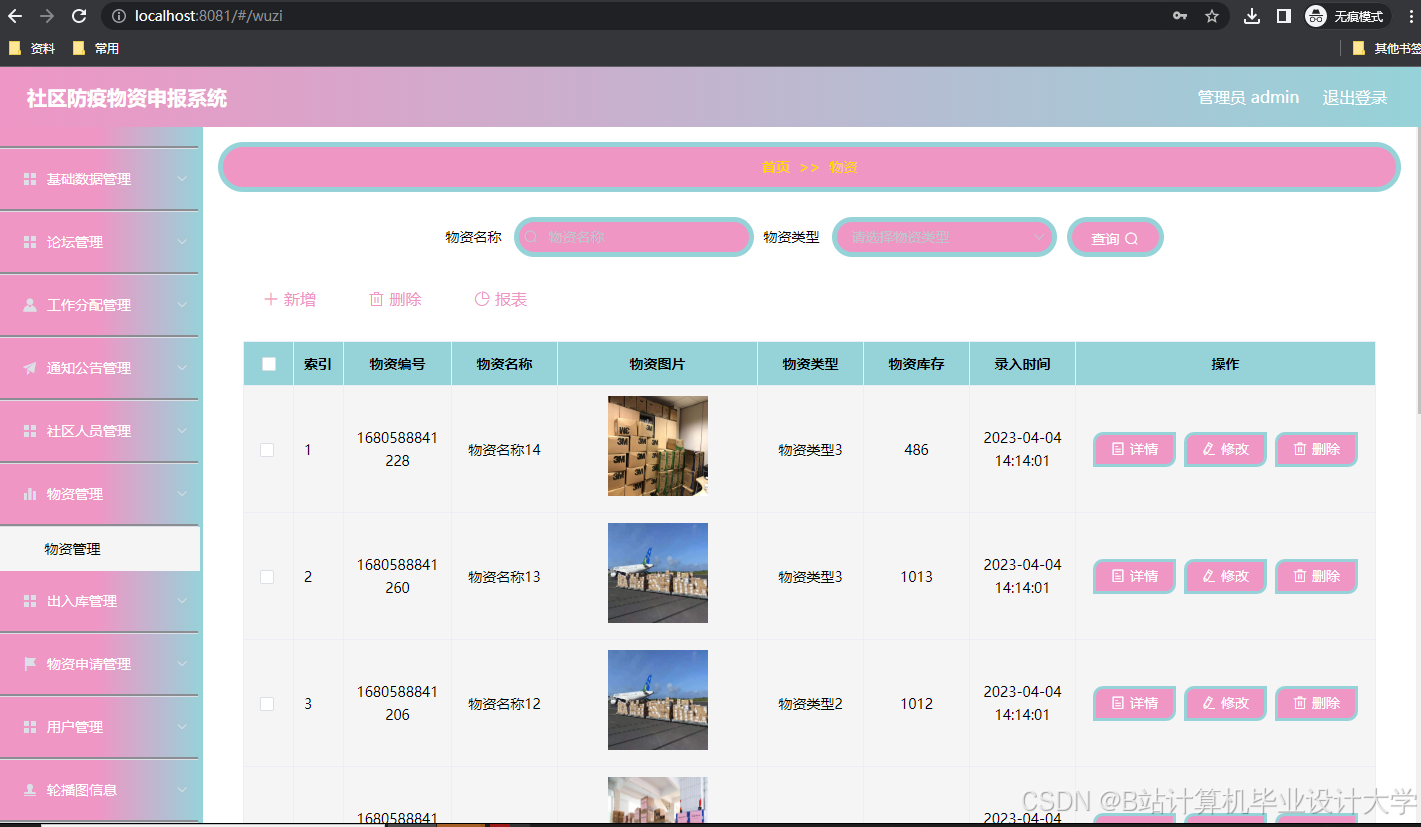 当前的网络技术,软件技术等都具备成熟的理论基础,市场上也出现各种技术开发的软件,这些软件都被用于各个领域,包括生活和工作的领域。随着电脑和笔记本的广泛运用,以及各种计算机硬件的完善和升级,市面上的电脑和笔记本的性能都得到提升,可以支持的软件也逐渐增多,因此,在计算机上安装软件来发挥其高效地信息处理的作用,则很受人们的青睐。对于社区防疫物资申报系统信息来讲,通过手工形式处理,在面对庞大的信息数量时,就显得不适宜了,首先需要花费的时间比较多,其次数据出错率比较高,而且对错误的数据进行更改也比较困难,最后,检索数据费事费力。因此,为了解决上述问题,有必要建立社区防疫物资申报系统,来规范社区防疫物资申报系统信息管理流程,让管理工作可以系统化和程序化,同时,社区防疫物资申报系统的有效运用可以帮助管理人员准确快速地处理信息。