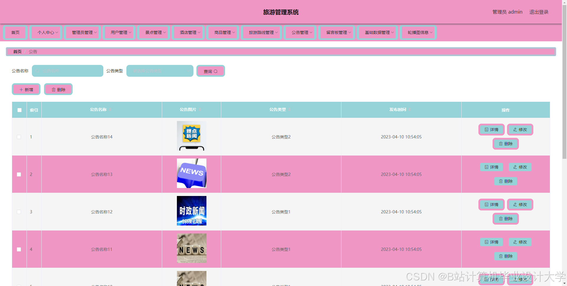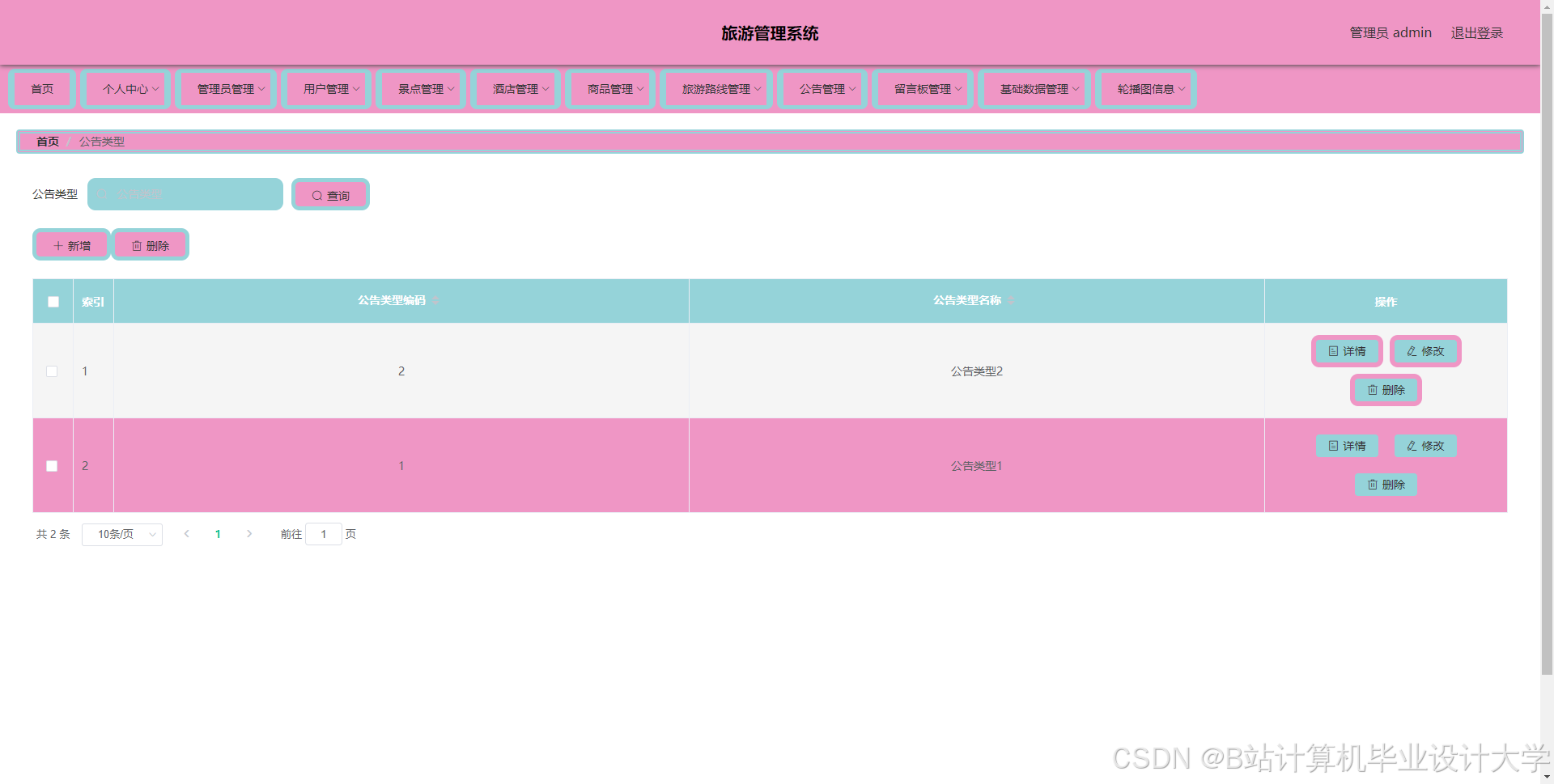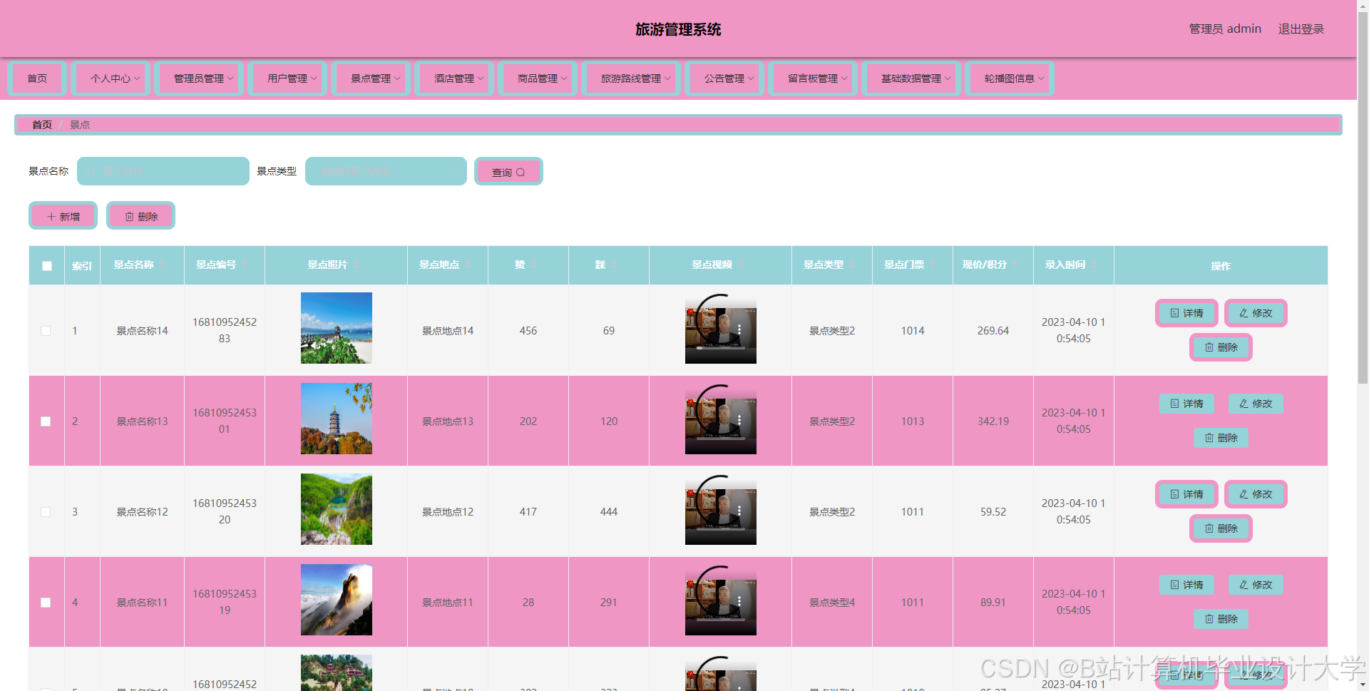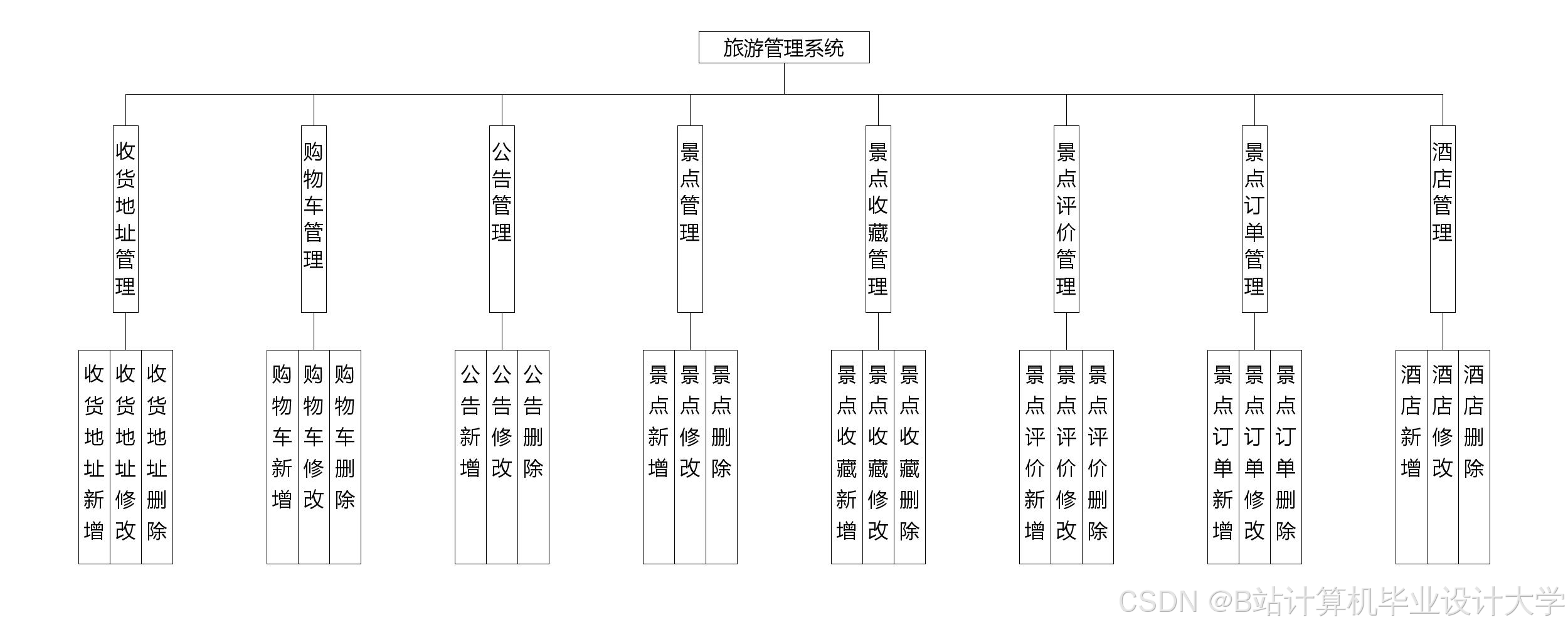 旅游管理系统管理系统按照操作主体分为管理员和用户。管理员的功能包括收货地址管理、购物车管理、字典管理、公告管理、景点管理、景点收藏管理、景点评价管理、景点订单管理、酒店管理、酒店收藏管理、酒店评价管理、酒店订单管理、留言板管理、旅游路线管理、旅游路线收藏管理、旅游路线评论管理、商品管理、商品收藏管理、商品评价管理、商品订单管理、用户管理、管理员管理。用户的功能等。该系统采用了Mysql数据库,Java语言,Spring Boot框架等技术进行编程实现。
