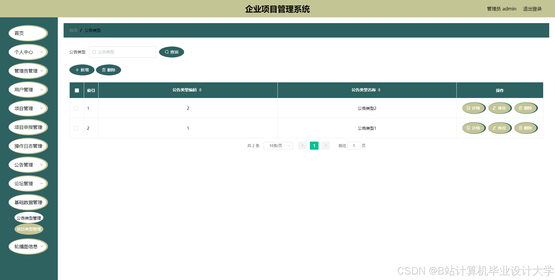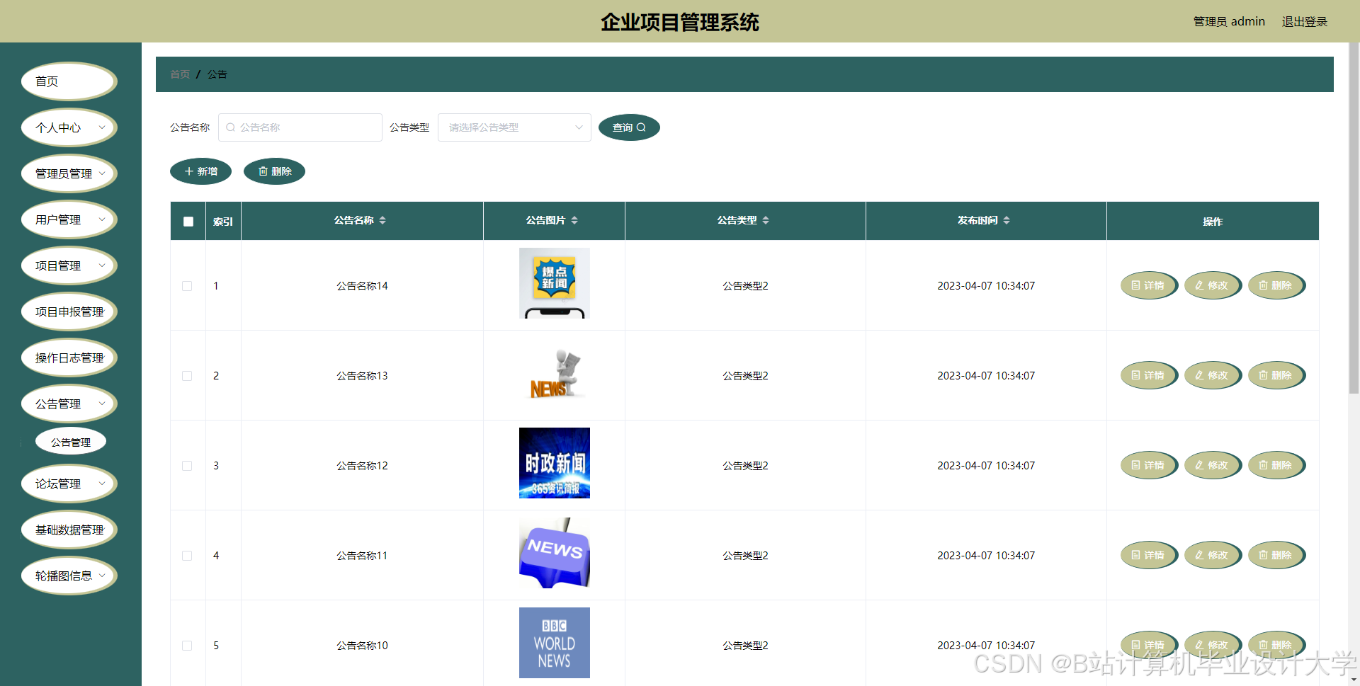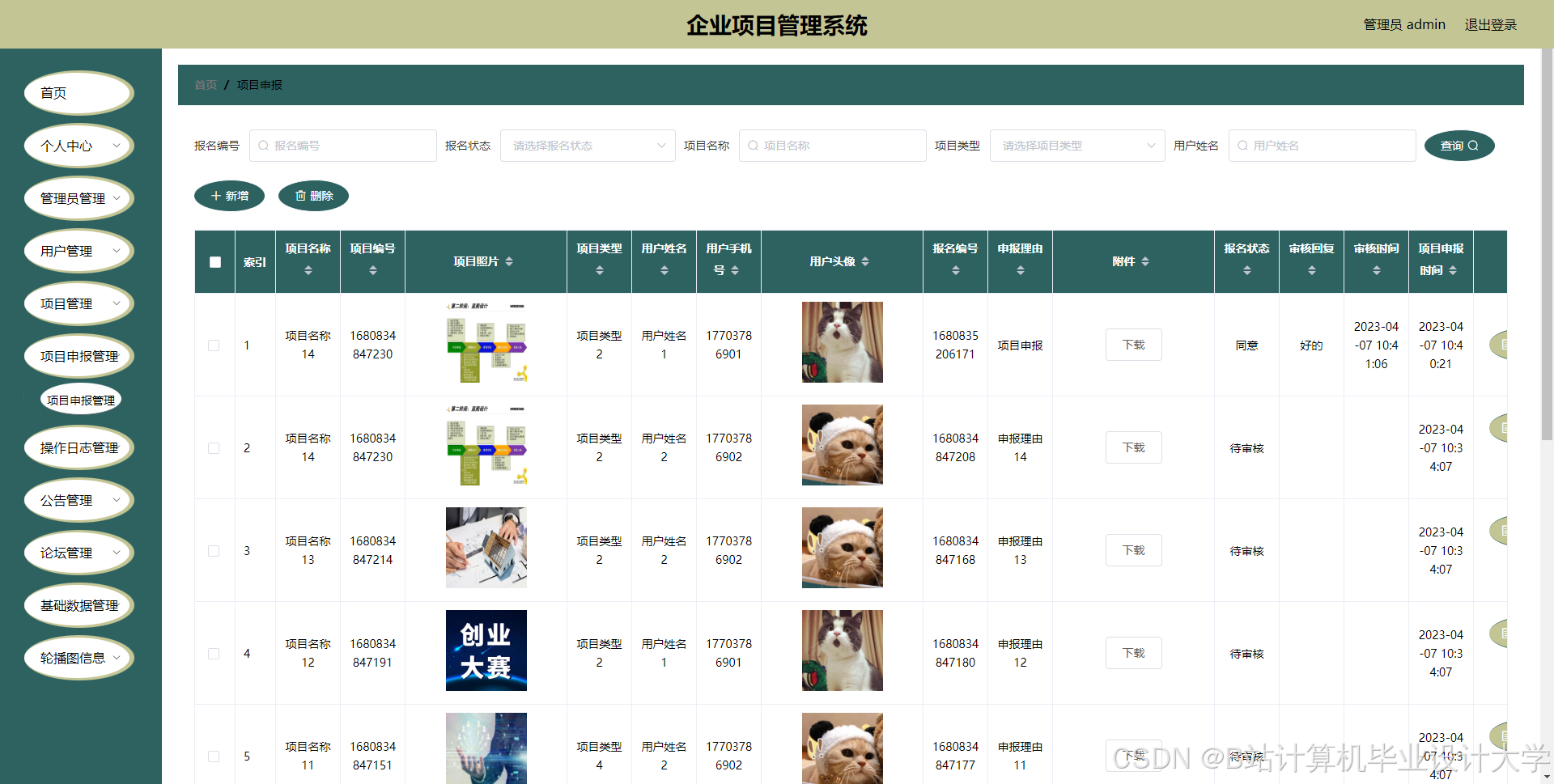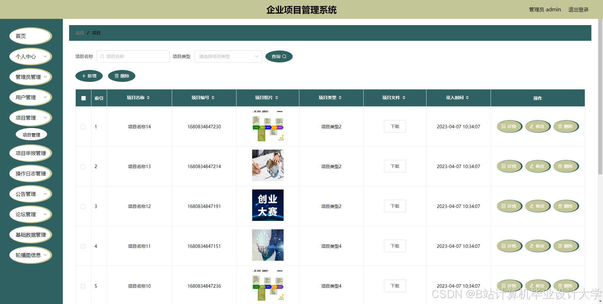 企业项目管理系统按照操作主体分为管理员和用户。管理员的功能包括操作日志管理、字典管理、论坛管理、公告管理、项目管理、项目申报管理、用户管理、管理员管理。用户的功能等。该系统采用了Mysql数据库,Java语言,Spring Boot框架等技术进行编程实现。