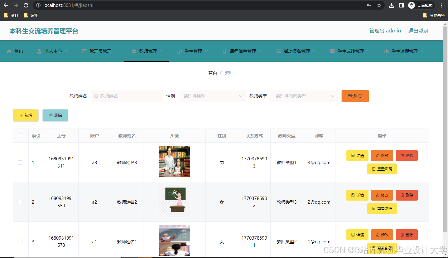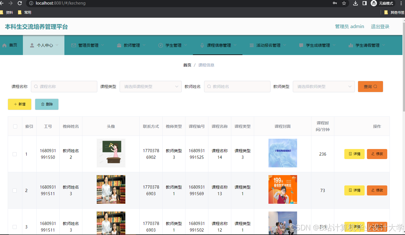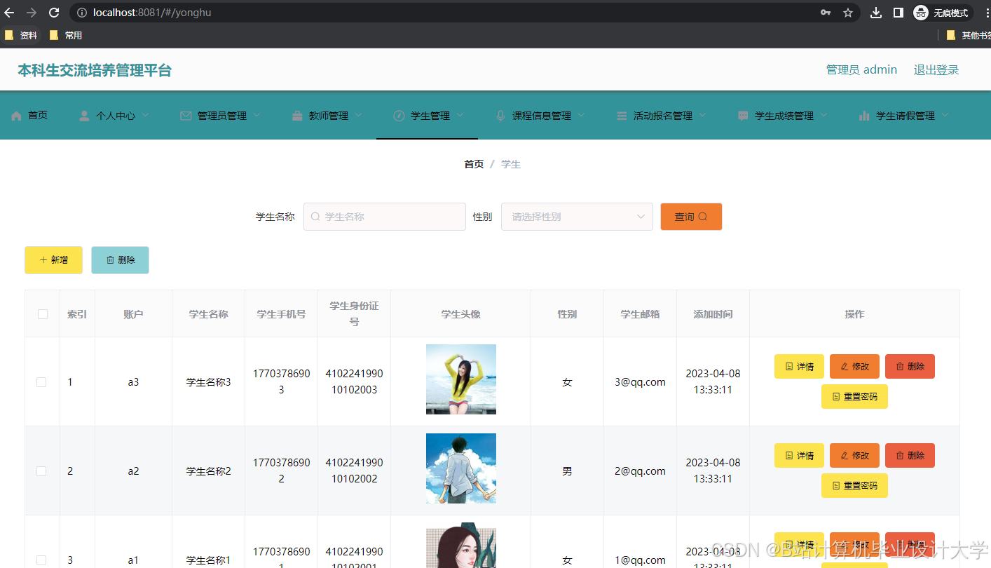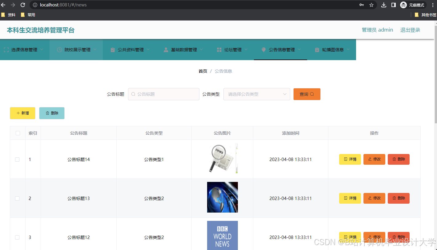 本科生交流培养管理平台是一款运用软件开发技术设计实现的应用系统,在信息处理上可以达到快速的目的,不管是针对数据添加,数据维护和统计,以及数据查询等处理要求,本科生交流培养管理平台都可以轻松应对。