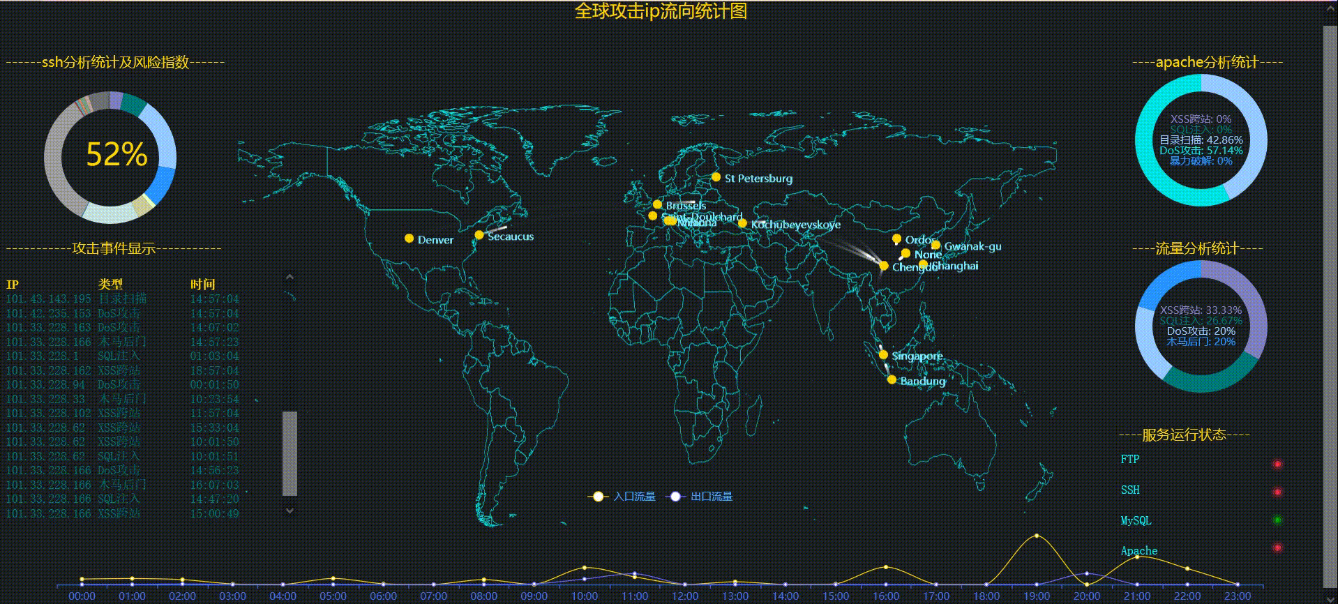- 利用Python深度学习框架和Linux系统环境下的开源工具,实现入侵检测系统、网络攻击安防系统和态势感知系统,并进行集成测试。