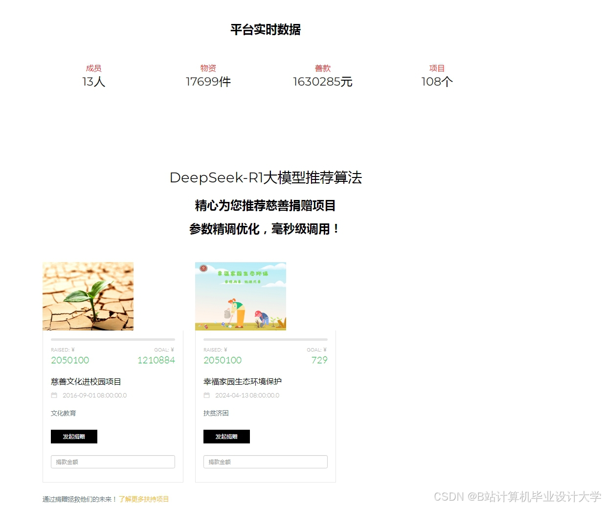 - 实践价值提升:通过构建高效的爱心捐赠项目推荐系统,提升捐赠体验,帮助捐赠者快速找到符合自己意愿的爱心捐赠项目,提高捐赠效率;同时,为公益组织提供有效的数据分析工具,帮助他们更好地了解捐赠者需求,优化资源配置,促进公益事业的健康发展。