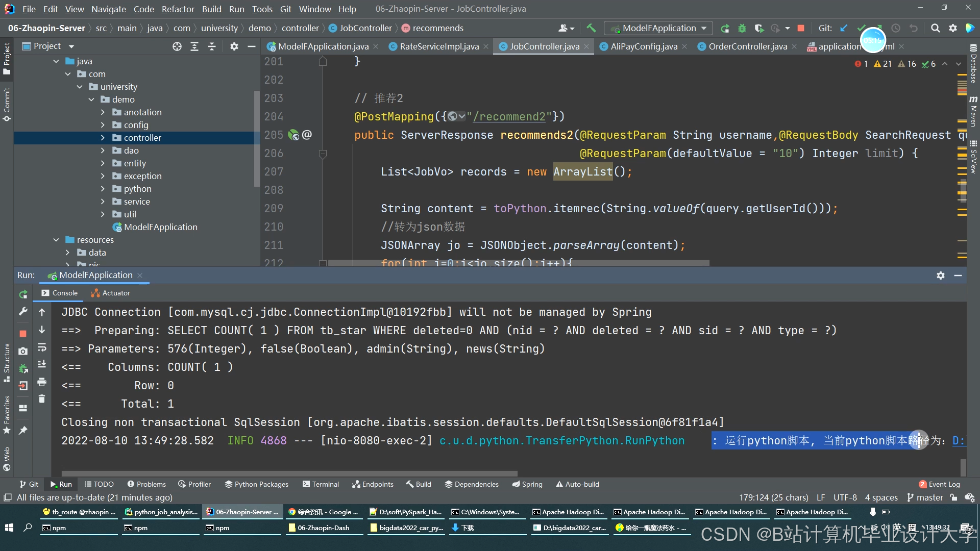 - 基于Spark的分布式计算能力,对招聘数据进行快速处理与分析,包括数据挖掘、关联分析、聚类分析等,提取有价值的信息和特征。