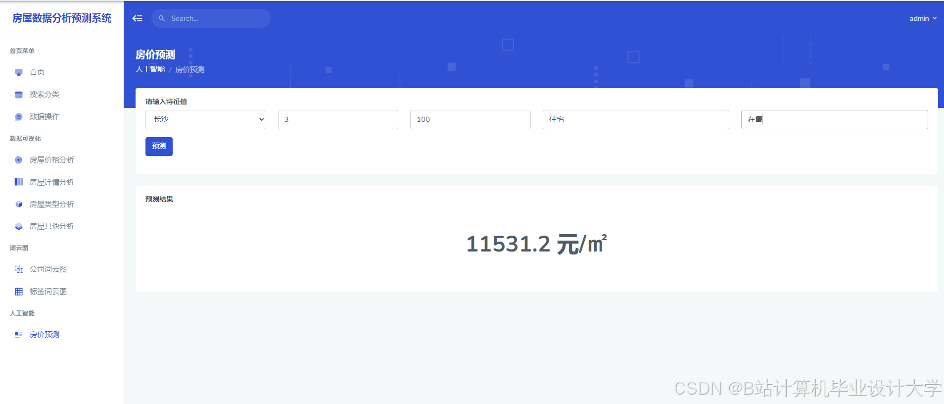 - 前端:利用Vue.js框架构建用户界面,包括房价预测结果展示、房源推荐结果展示和房源可视化展示等功能模块。