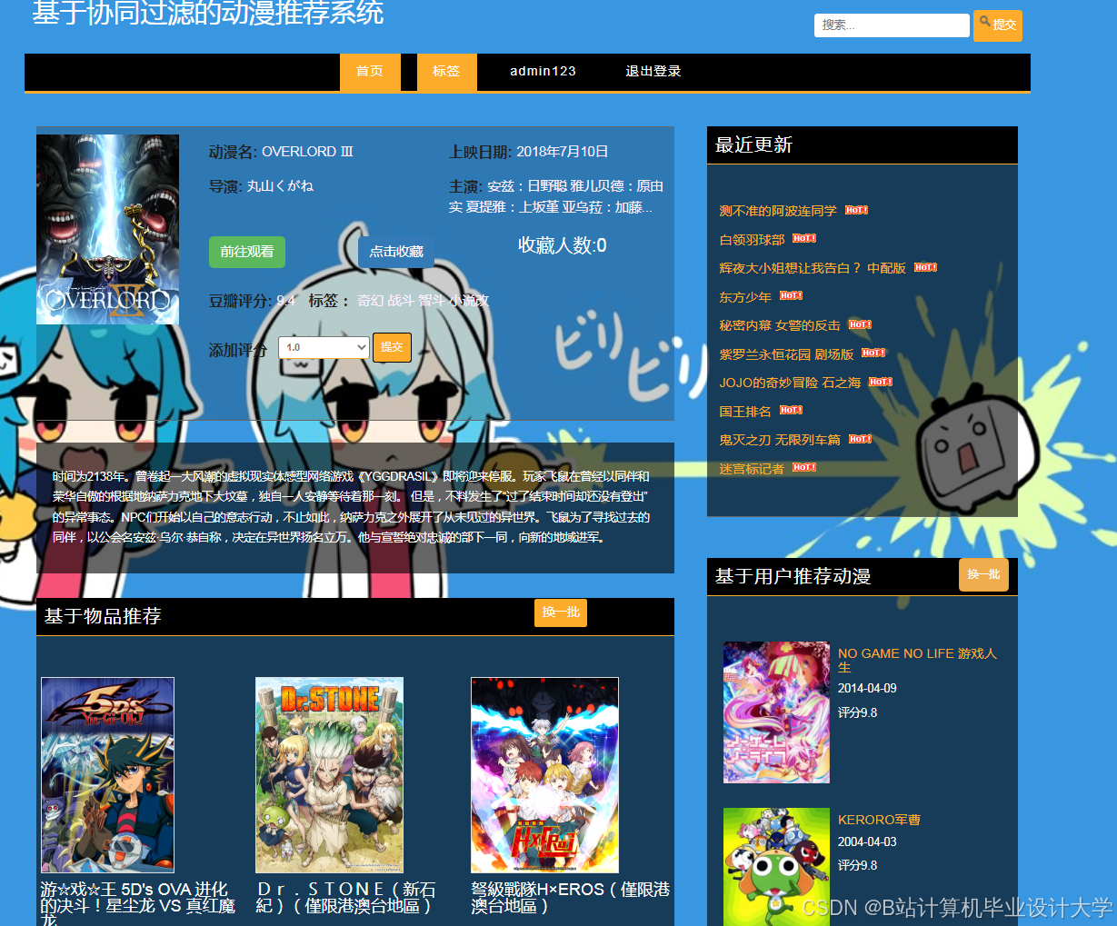 通过以上步骤,该推荐系统实现了基于用户和基于物品的推荐功能,根据用户的标签行为和评分情况,给用户推荐其感兴趣的动漫。系统具有良好的用户界面和高准确率的推荐效果,用户可以方便地查看动漫信息、观看动漫、给动漫评分等操作。整个系统的开发过程经过详细的设计和功能测试,并成功应用于实际场景中。