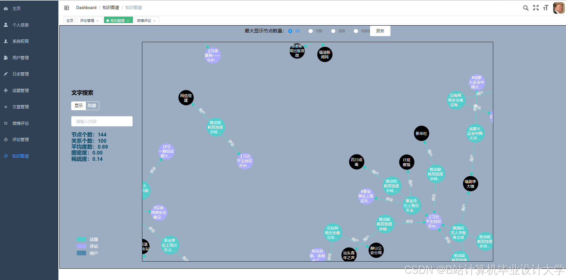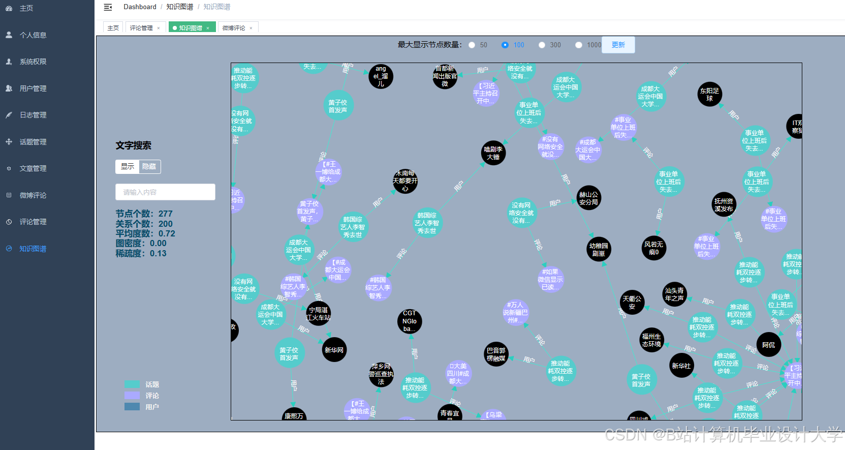 - 开发可视化系统,实现情感分布热力图、舆情传播链路及用户画像的动态展示。