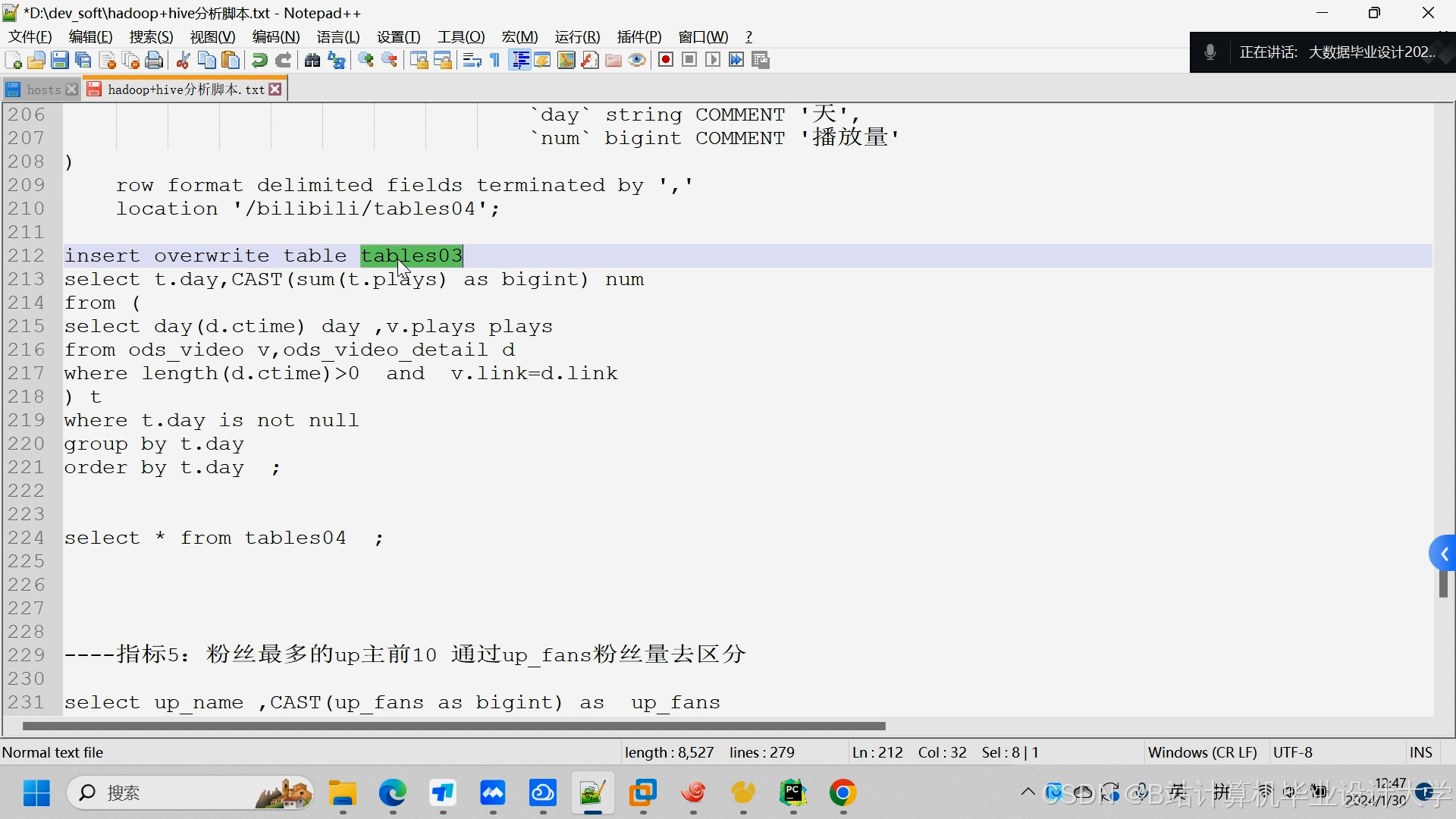 利用Spark进行数据清洗、转换和分析,去除噪声数据和重复数据,提取用户行为特征、漫画特征、流行趋势等关键信息。使用Hive进行数据查询和统计,生成漫画作品的流行度、评分分布等统计结果。