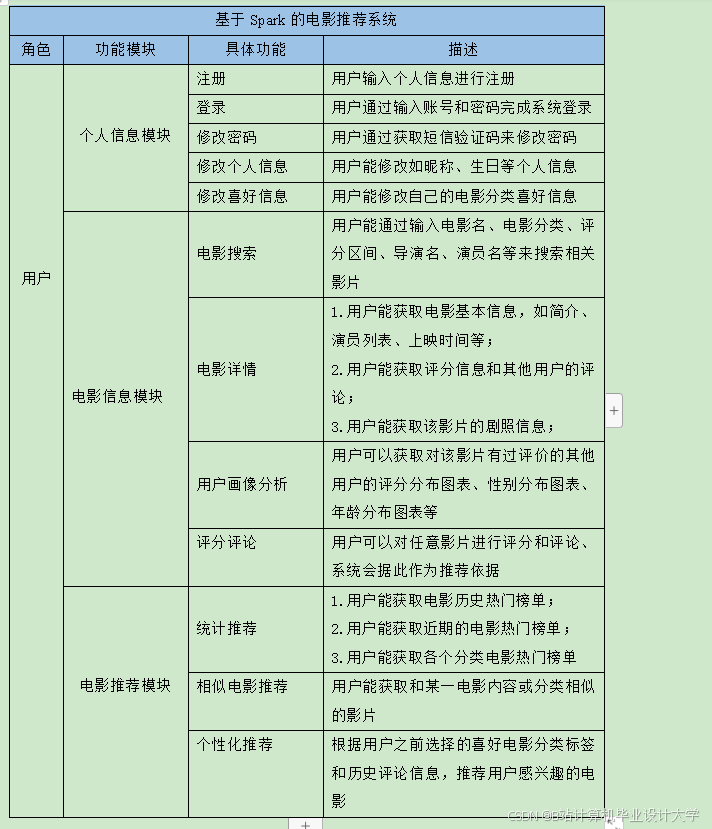 研究并实现基于协同过滤、基于内容的推荐算法或混合推荐算法,根据用户的观影历史和电影特征,为用户推荐符合其口味的电影。利用Spark MLlib等机器学习库进行算法实现和优化。