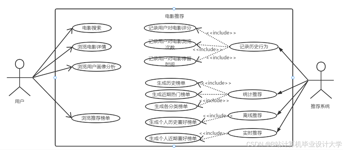 - 系统设计与实现:设计并实现电影推荐系统的功能模块,包括用户管理、电影资源管理、推荐算法模块等;前端采用Vue.js或React等框架实现用户交互界面,后端采用Spring Boot或Django等框架实现业务逻辑;