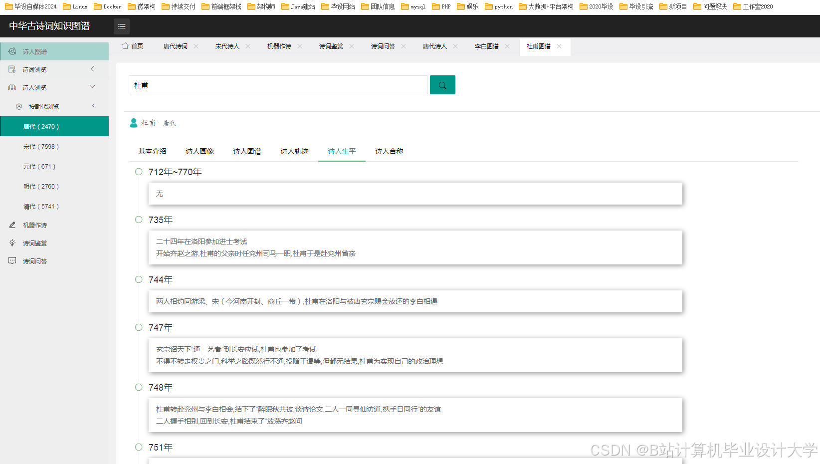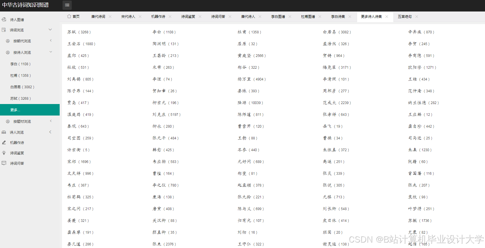 - 设计并实现古诗词可视化展示功能,如诗词关系网络图、作者朝代分布图等。