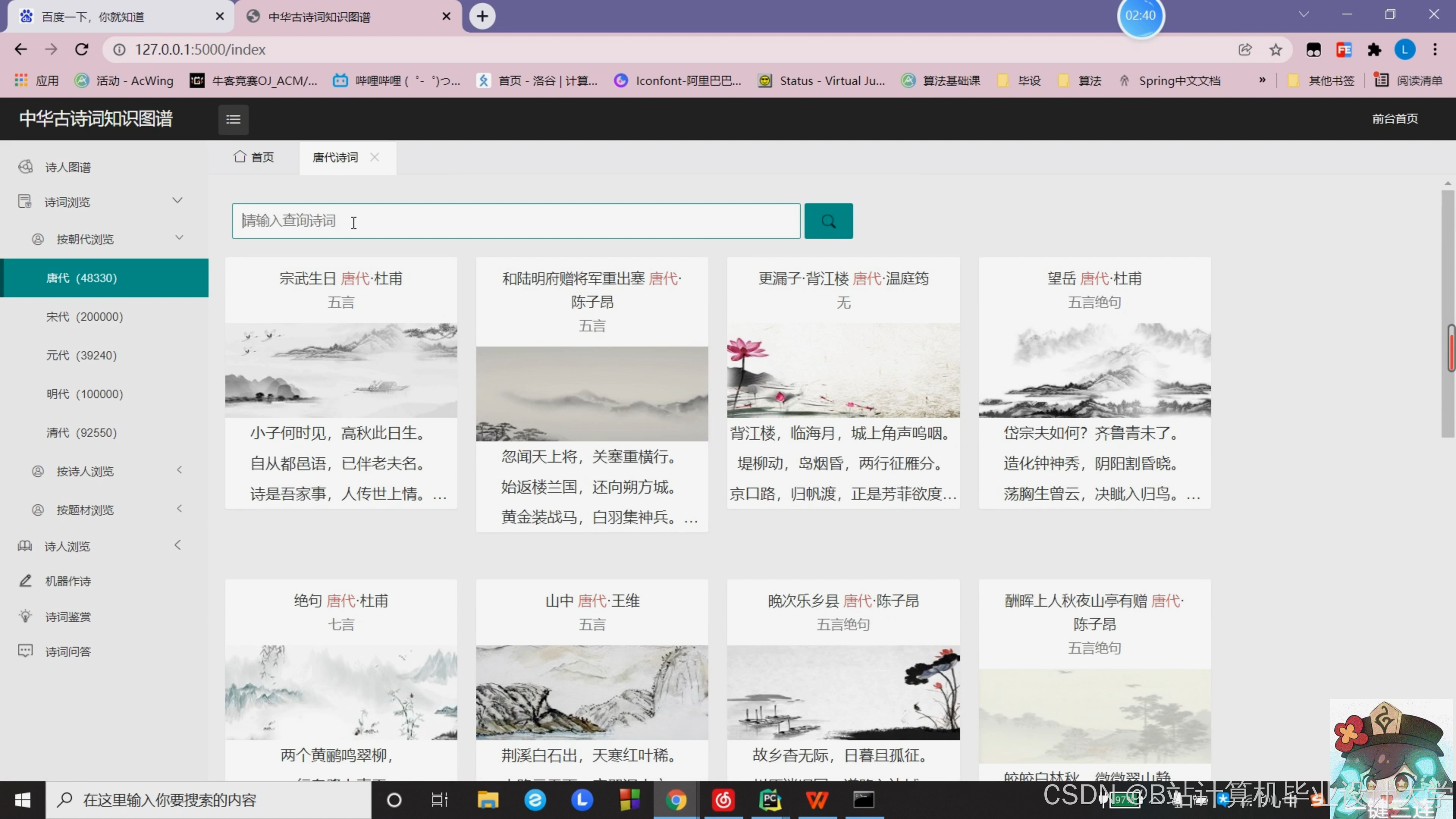 - 开发一个基于Python的中华古诗词知识图谱可视化系统,用户可以通过该系统直观地浏览和查询古诗词知识,了解诗词之间的关联关系。