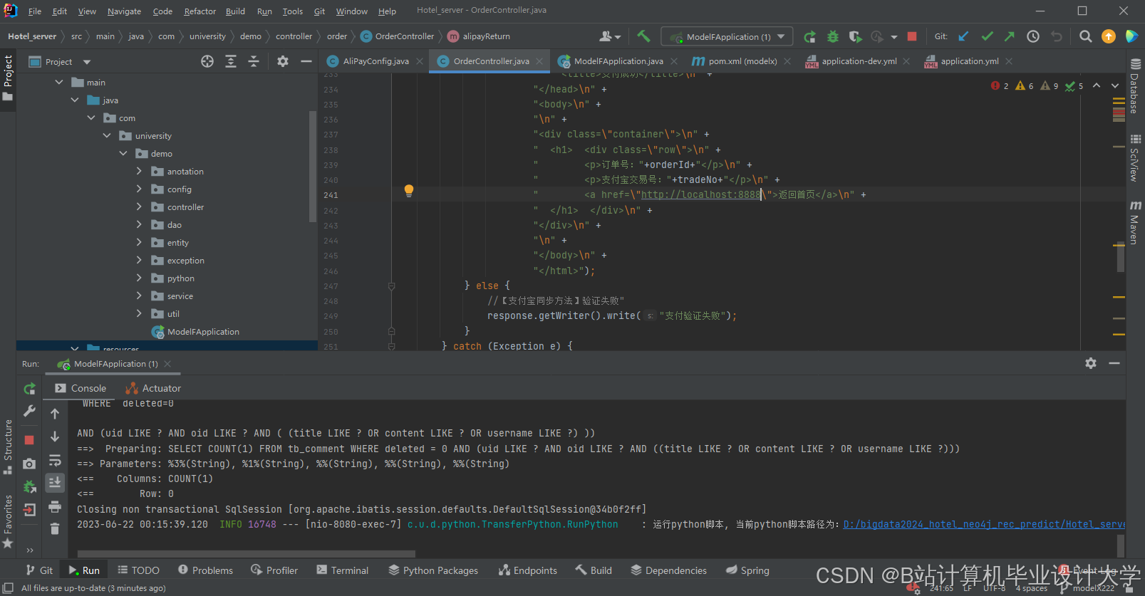- ALS算法原理:基于Spark MLlib的ALS(交替最小二乘法)算法,将用户—酒店交互矩阵分解为用户潜在因子矩阵和酒店潜在因子矩阵,通过最小化预测误差来求解潜在因子。