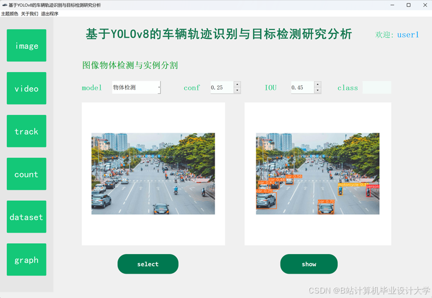 随着城市交通流量的日益增大,交通管理面临着车辆监控、流量统计、事故预防等诸多挑战。传统交通监测方法效率低、精度差,难以满足现代交通管理的需求。深度学习技术凭借其强大的特征提取和模式识别能力,在图像和视频分析领域取得了显著成果。Python 作为深度学习领域的主流编程语言,拥有丰富的开源库和框架,为车辆轨迹识别与目标检测分析系统的开发提供了有力支持。本项目旨在利用 Python 深度学习技术,构建一个高效、准确的车辆轨迹识别与目标检测分析系统,以提升交通管理的智能化水平。