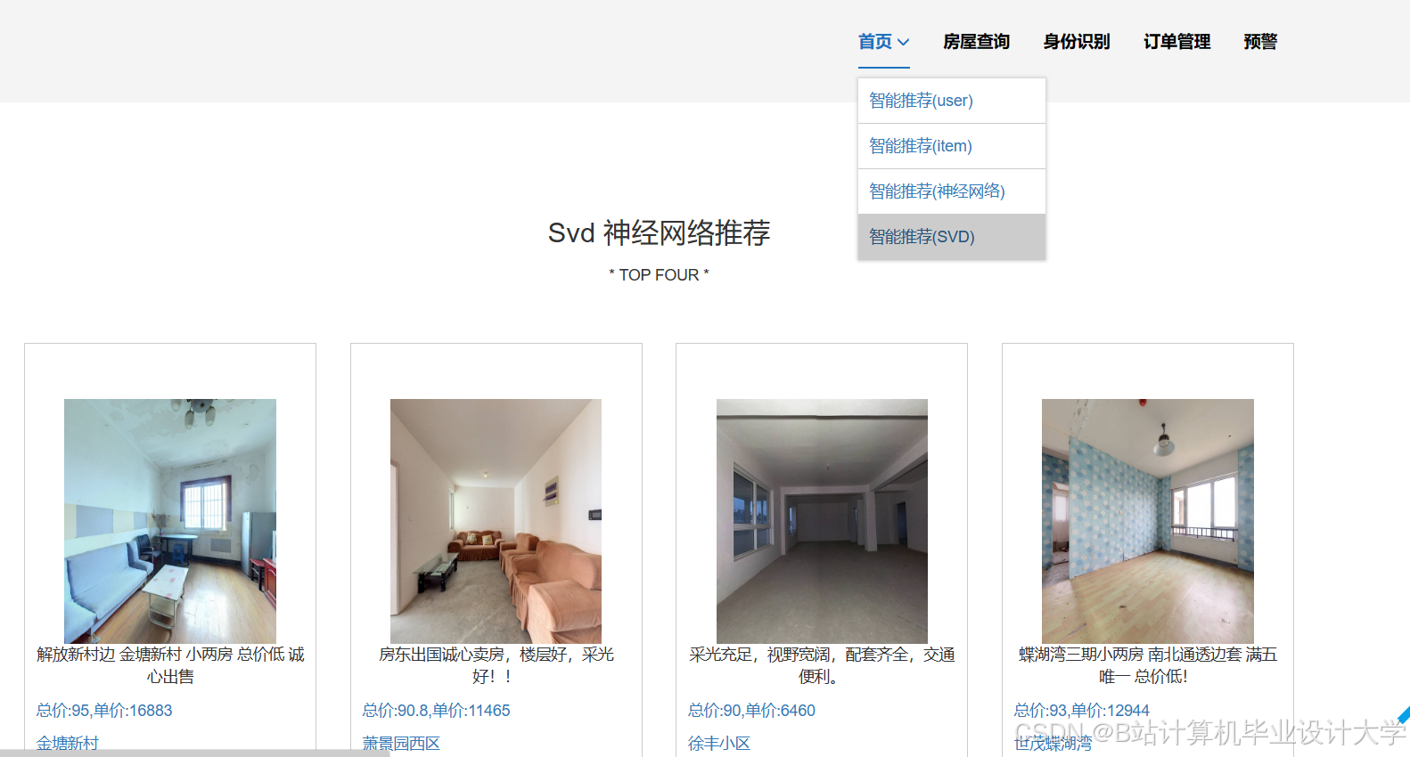 - 设计房源推荐算法,结合基于内容的推荐和协同过滤推荐等方法,实现个性化的房源推荐。