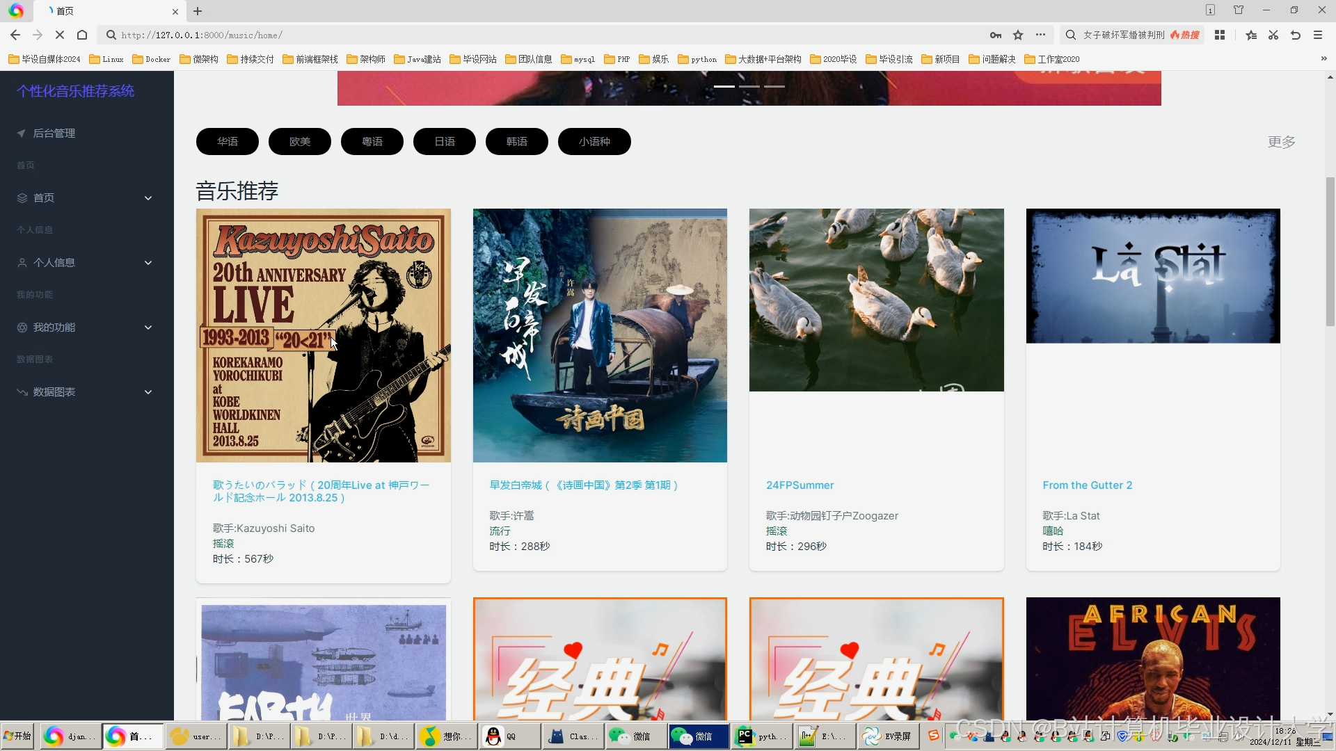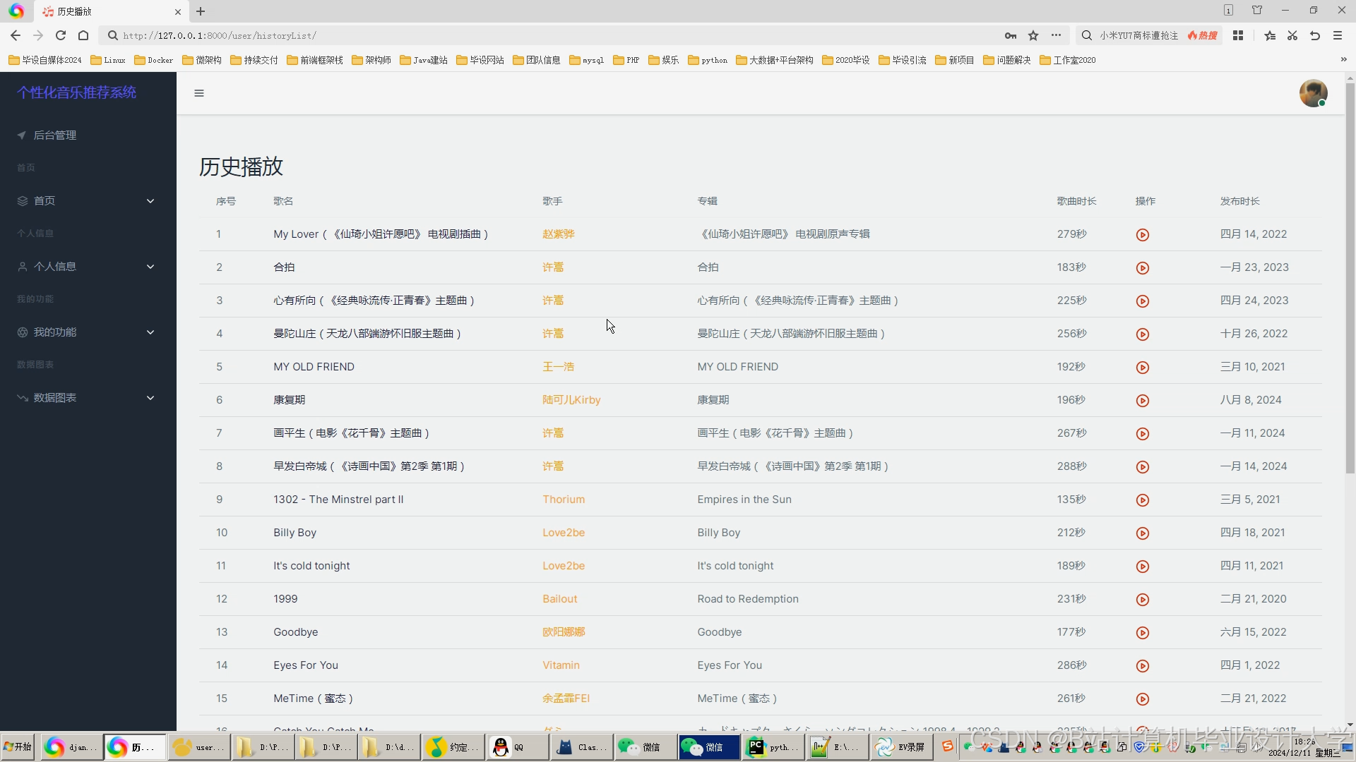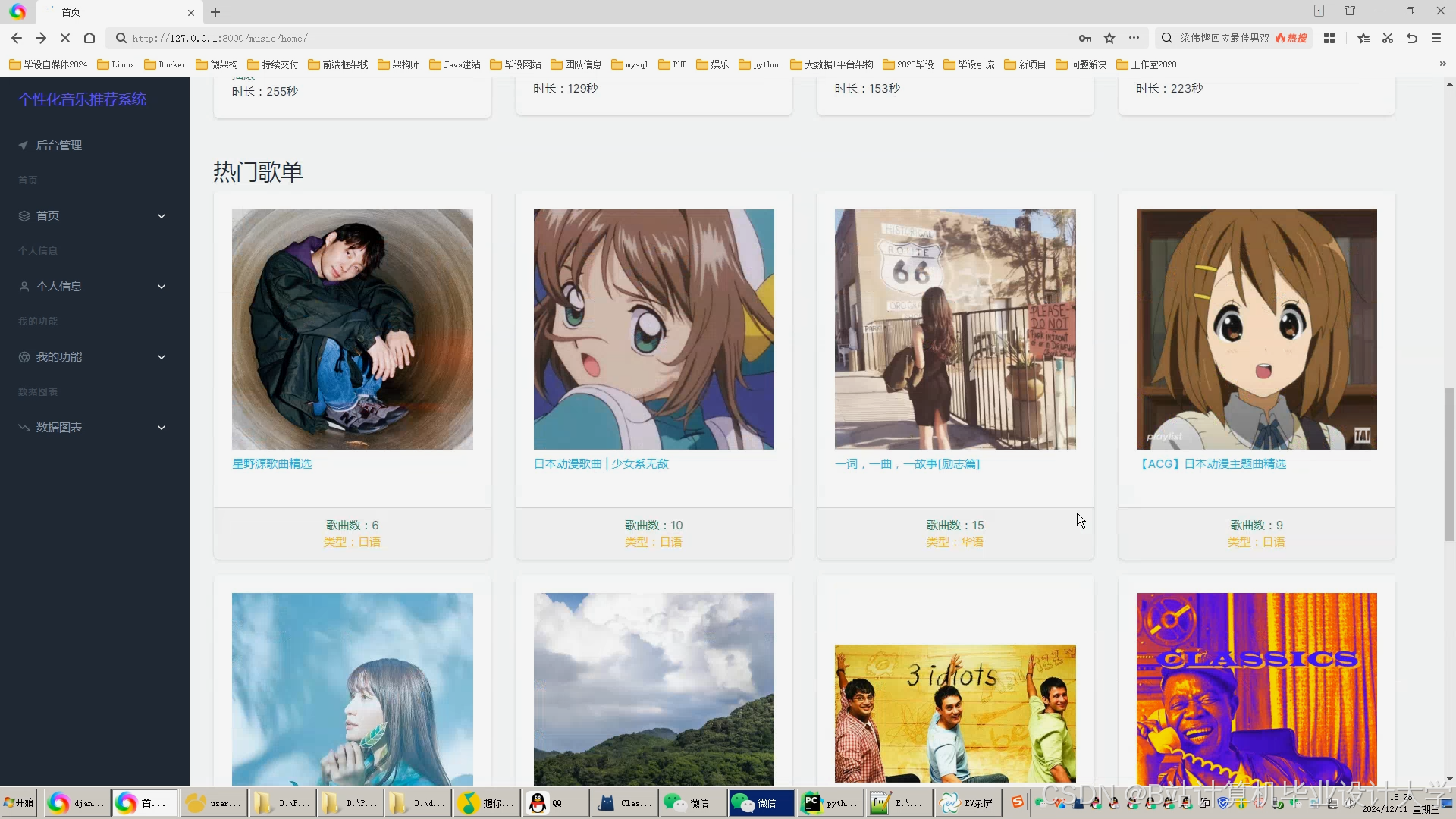 - 完成音乐推荐系统的设计与开发:实现一个基于 Python + 大模型的音乐推荐系统,具备个性化音乐推荐、高效数据处理与模型训练、良好系统交互体验等功能。