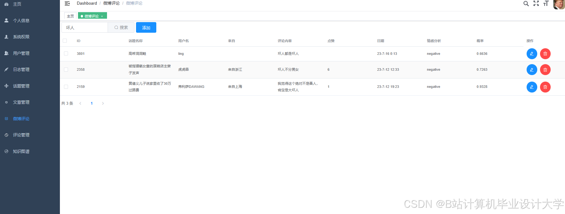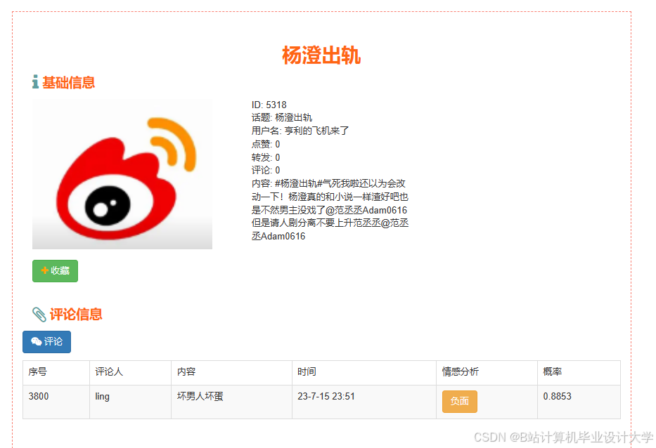 - 情感分析:基于 Python 的自然语言处理库(如 NLTK、SnowNLP 等),结合机器学习算法(如朴素贝叶斯、支持向量机等)或深度学习算法(如 LSTM、BERT 等),对微博文本进行情感倾向判断,分为正面、负面和中性三类。