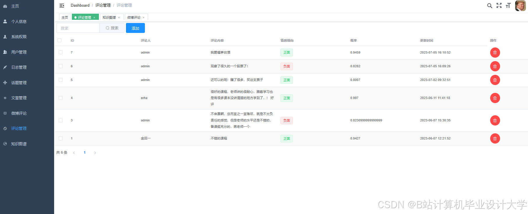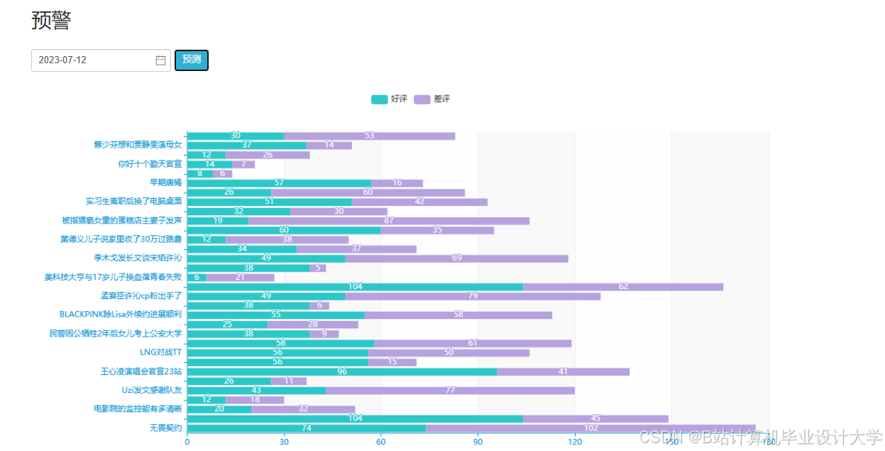 - 情感分析:基于 Python 的机器学习库(如 scikit-learn)和深度学习框架(如 TensorFlow 或 PyTorch),结合 Spark 的并行计算能力,训练情感分析模型,并对新数据进行情感判断。
