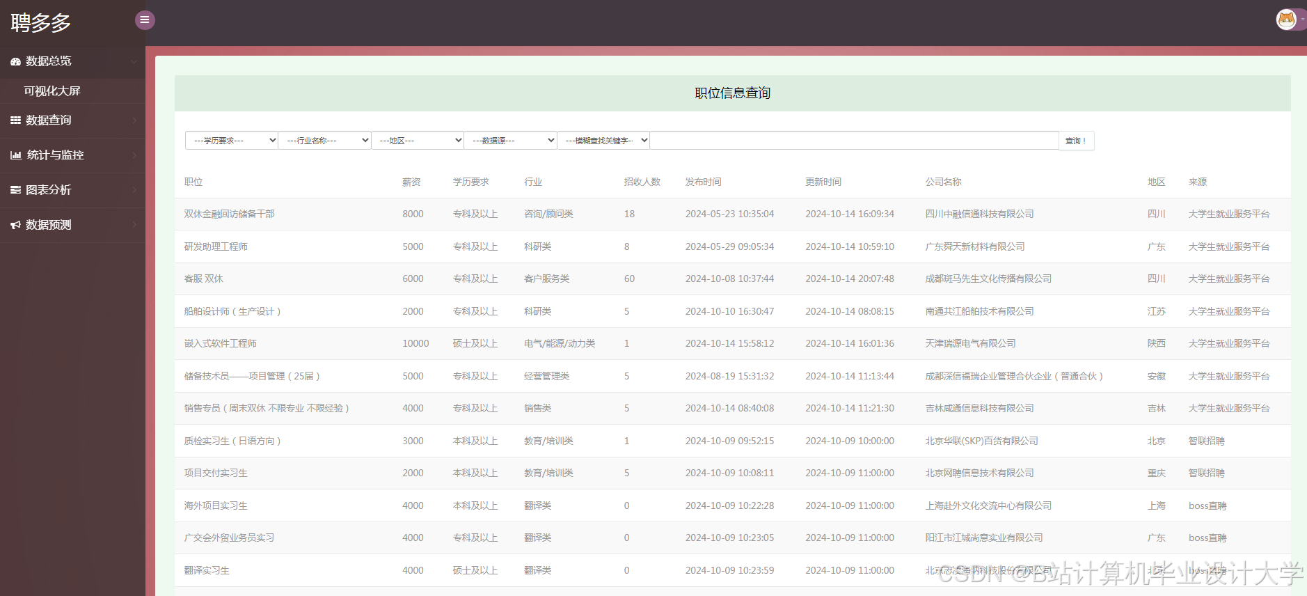在数字化时代,人才市场竞争激烈,企业和求职者都面临着信息过载的问题。企业难以快速精准地筛选出合适的候选人,求职者也难以找到匹配自身技能和期望薪资的工作。随着人工智能技术的发展,Python编程语言与大模型在自然语言处理、数据分析等领域展现出强大能力,为解决招聘领域的这些问题提供了新的思路和方法。基于Python+大模型的薪资预测与招聘推荐系统应运而生,旨在提高招聘效率和质量,促进人才市场的合理流动。