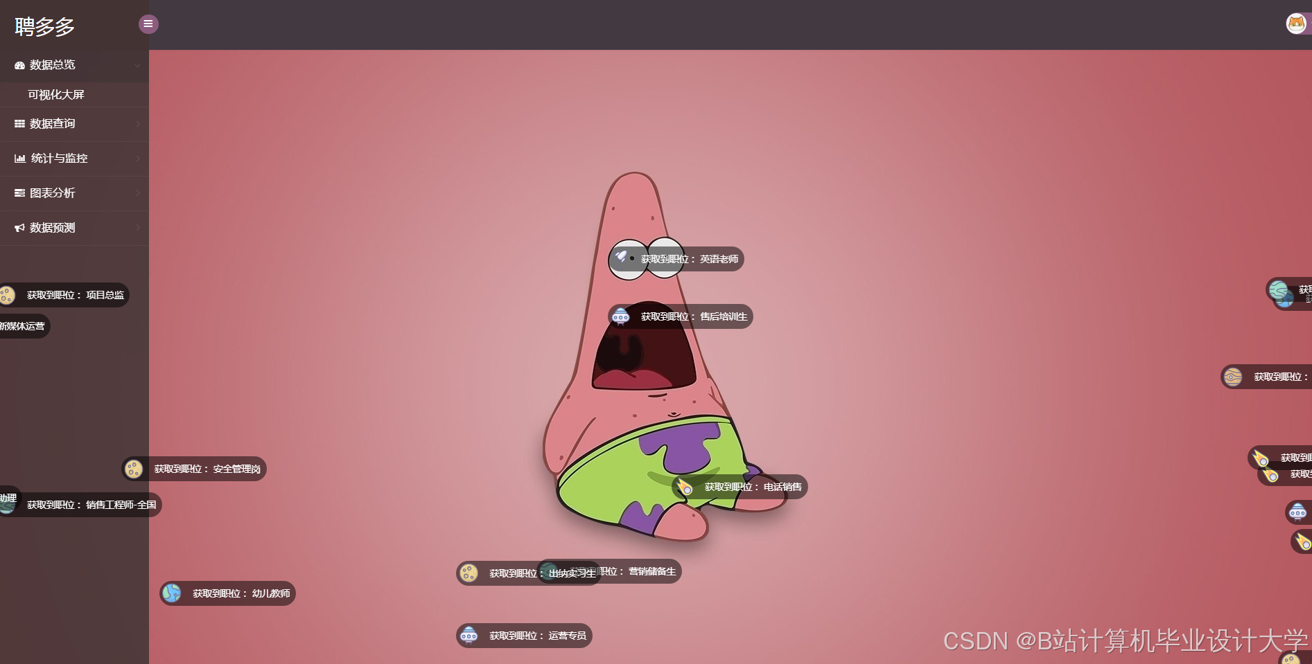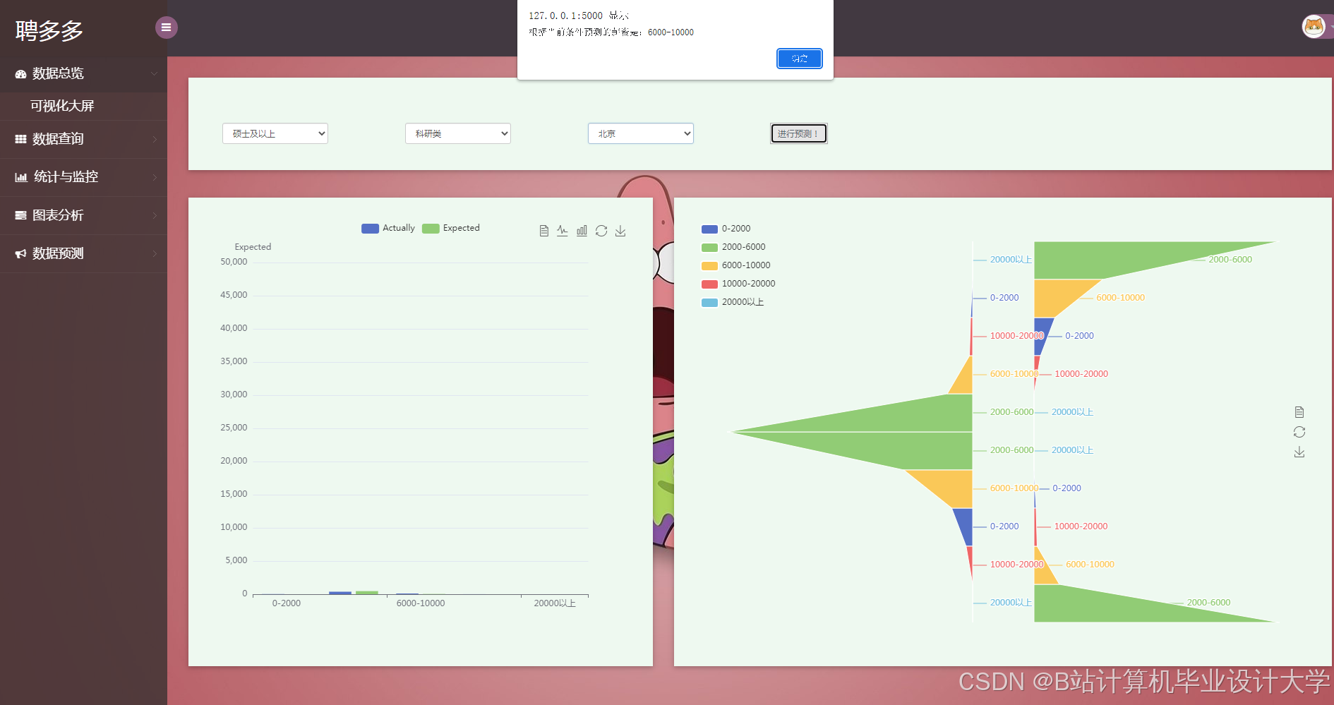 提供Web界面,用户可以通过浏览器访问系统,查看招聘数据、进行薪资预测和获取招聘推荐结果。系统还提供数据可视化功能,帮助用户更好地理解数据和模型输出。