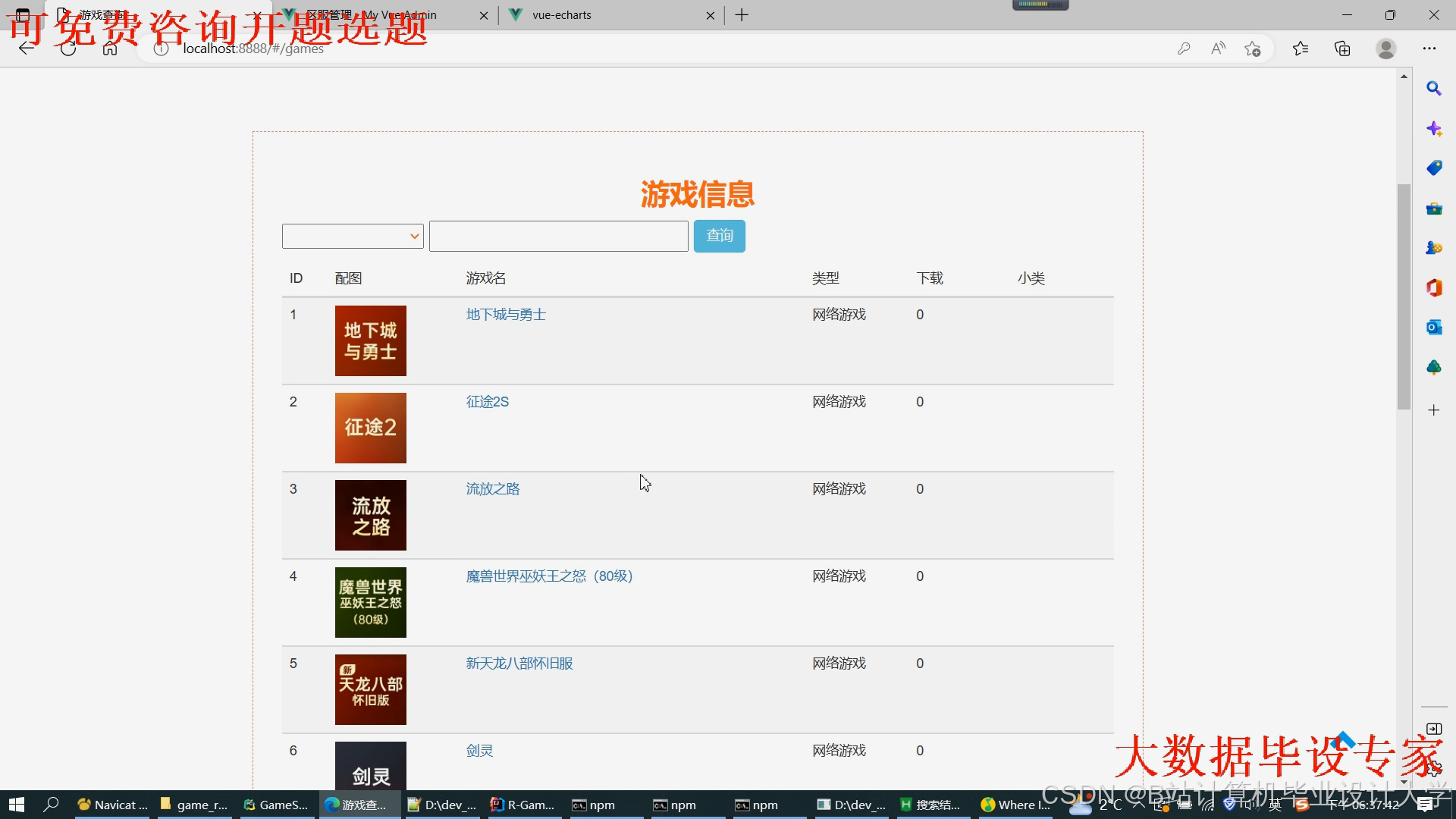 - 数据层:利用HDFS存储游戏相关的海量数据,包括游戏名称、类型、玩法、评分、发布时间等。同时,使用Hive建立数据仓库,对数据进行组织和管理,提供高效的数据查询接口。