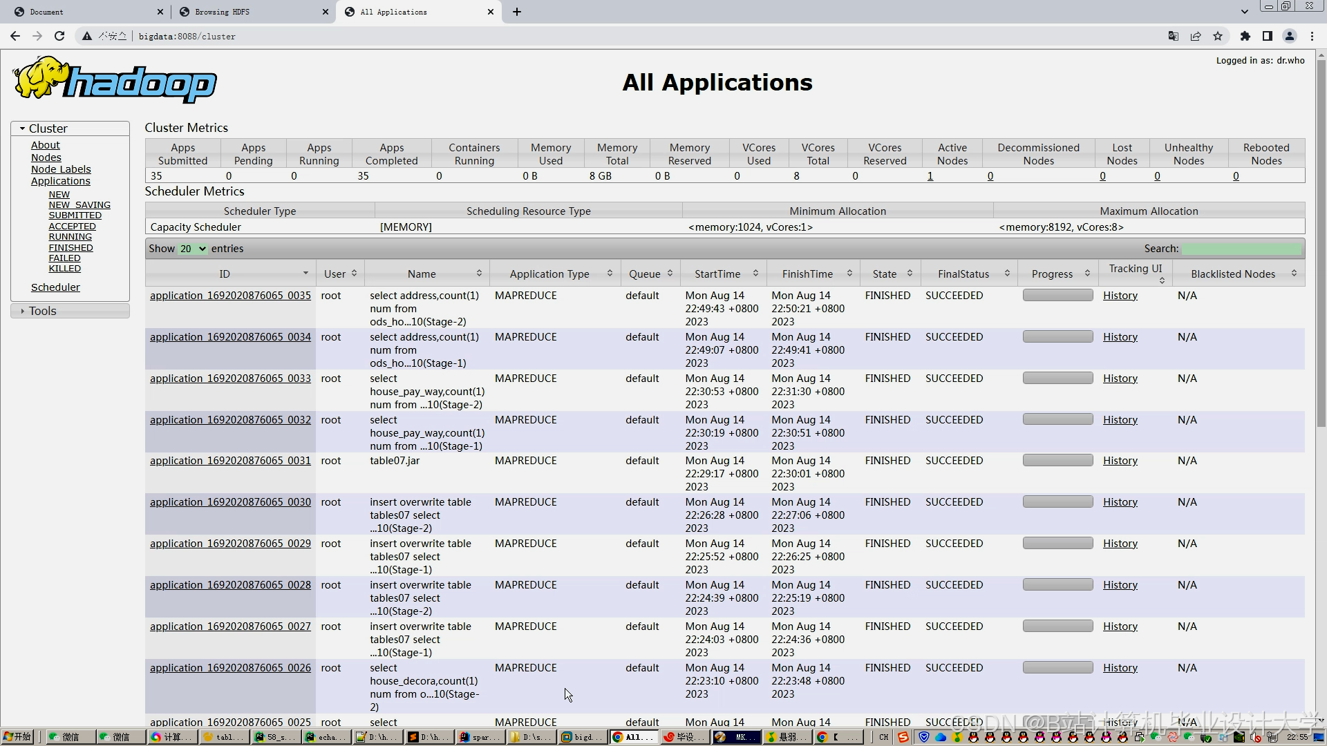 - 数据仓库:Hive 3.1.3(提供类SQL查询接口);