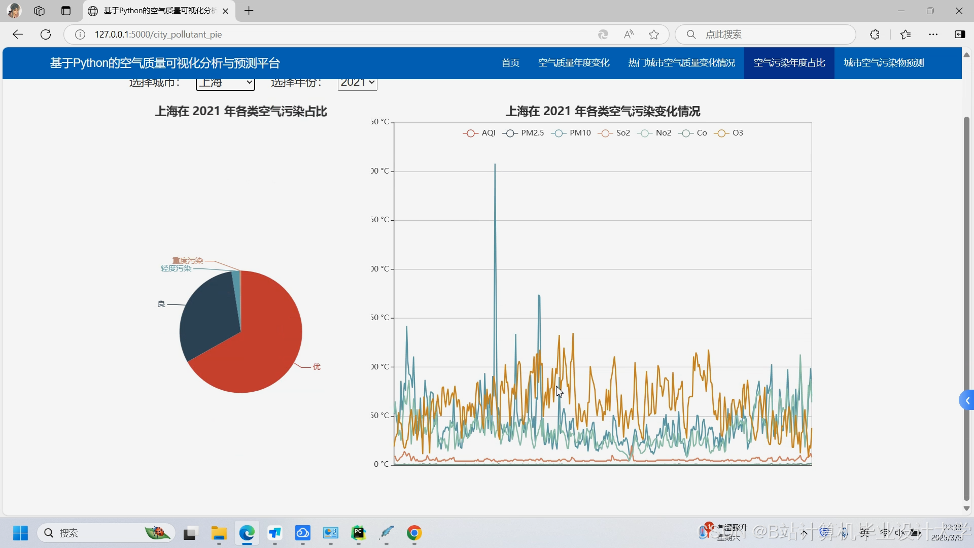 - 可视化展示模块:基于Pyecharts实现空气质量趋势图、区域对比图、污染扩散热力图等可视化展示,支持多条件筛选(如“某城市+未来24小时+PM2.5”),方便用户直观了解空气质量变化情况。