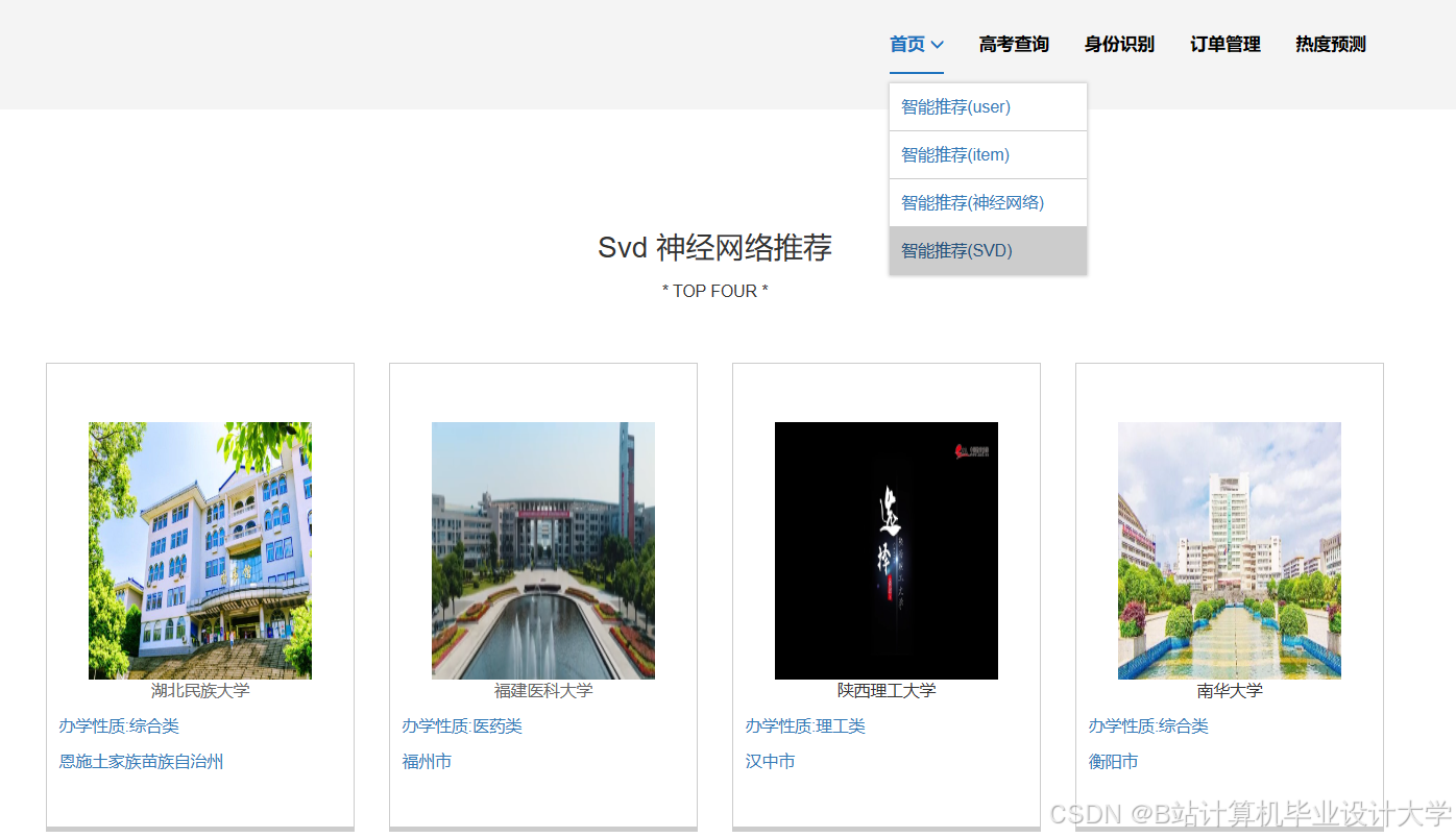 - 协同过滤(CF):基于用户-物品交互矩阵(如考生收藏院校记录),计算余弦相似度推荐相似院校。