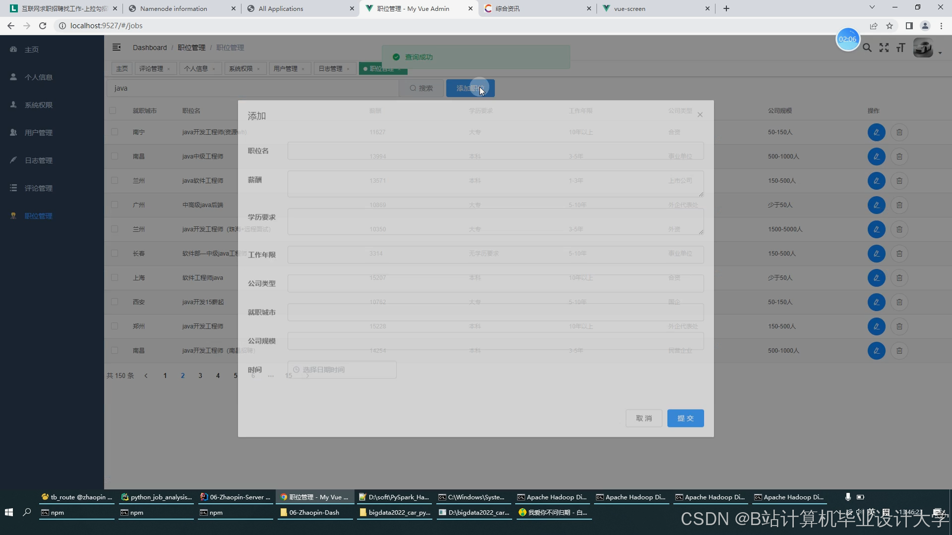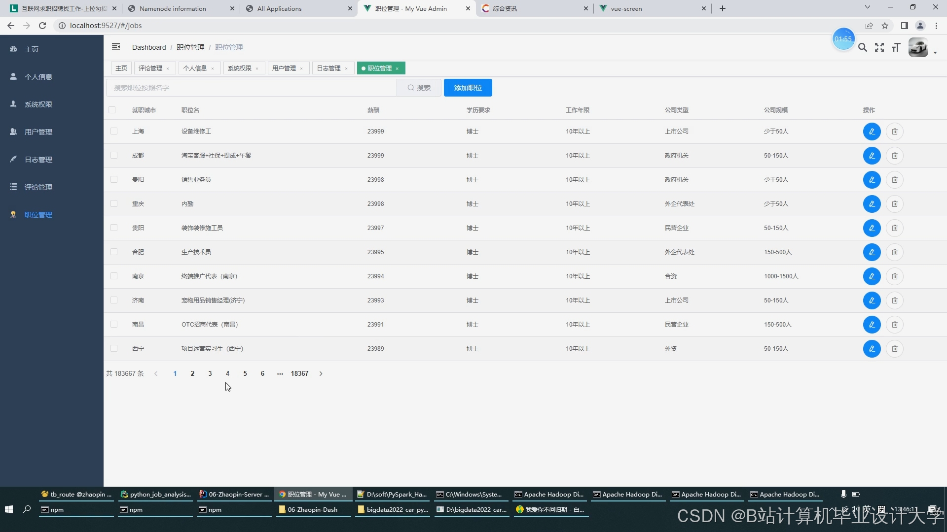 Hadoop通过HDFS(分布式文件系统)和MapReduce(批处理计算模型)解决了大规模数据存储与处理问题。文献[1]指出,HDFS的高容错性和水平扩展性使其成为招聘数据存储的首选方案,而MapReduce的批处理模式适用于求职者行为日志分析等离线任务。然而,MapReduce的磁盘I/O开销较大,难以满足实时分析需求。