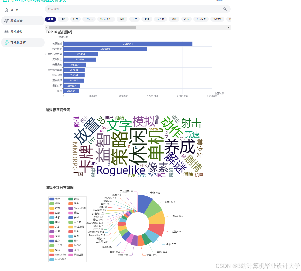 游戏产业已成为全球娱乐经济的重要组成部分,但用户面临“选择困难”问题日益突出。传统推荐方式(如热门榜单、关键词搜索)难以满足个性化需求,导致用户留存率下降、平台收益受损。在此背景下,基于用户行为数据与机器学习算法的个性化推荐系统成为研究热点。Django作为Python生态的主流Web框架,提供ORM、RESTful API开发、安全防护等功能;Vue.js凭借组件化开发与虚拟DOM技术,实现高效前端交互。两者的结合为构建高并发、可扩展的游戏推荐系统提供了技术支撑。