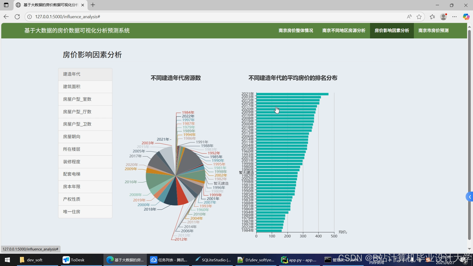 - 应用层:采用前后端分离的开发模式,前端使用Vue.js框架构建用户界面,提供用户登录注册、房源信息查询、房价预测结果展示和推荐列表展示等功能。后端使用Flask框架搭建服务器,与Hadoop、Spark和Hive进行交互,提供RESTful API接口,处理用户的请求并返回相应的数据。