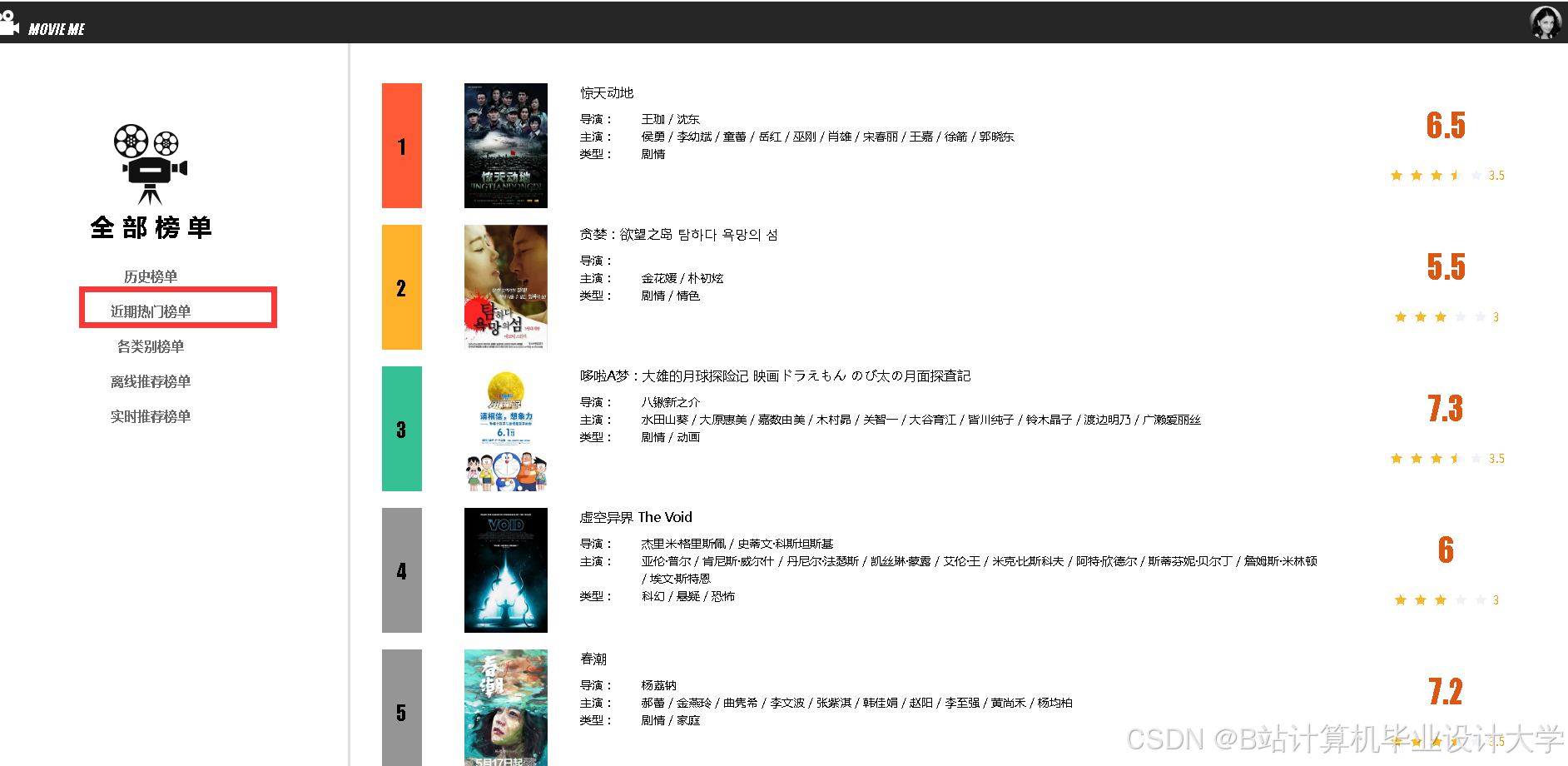 - 使用ECharts展示推荐电影的评分分布(柱状图)、类型占比(饼图)。
