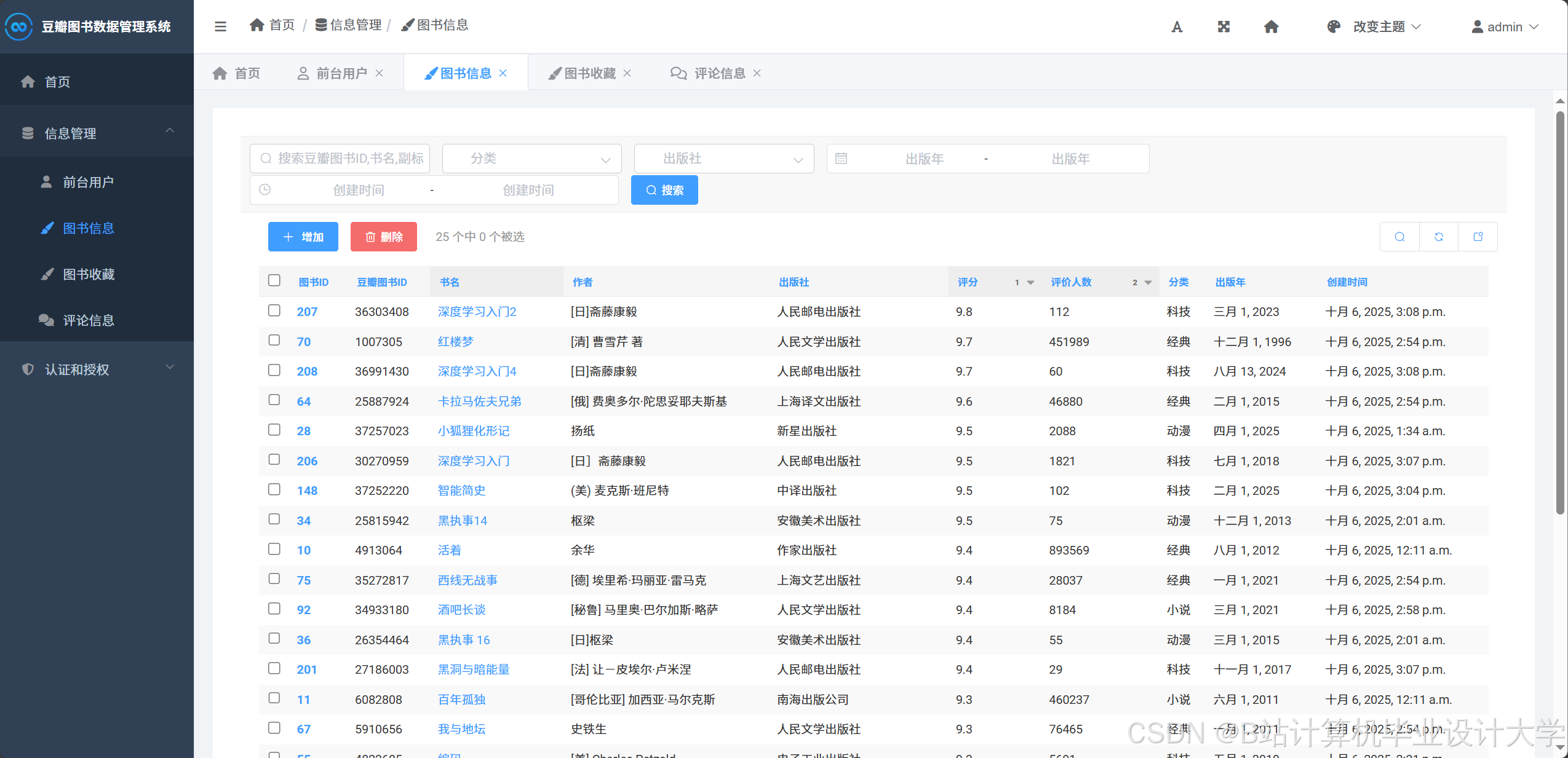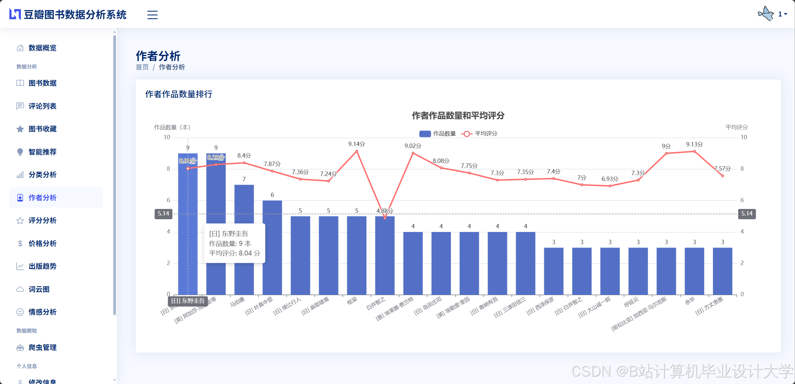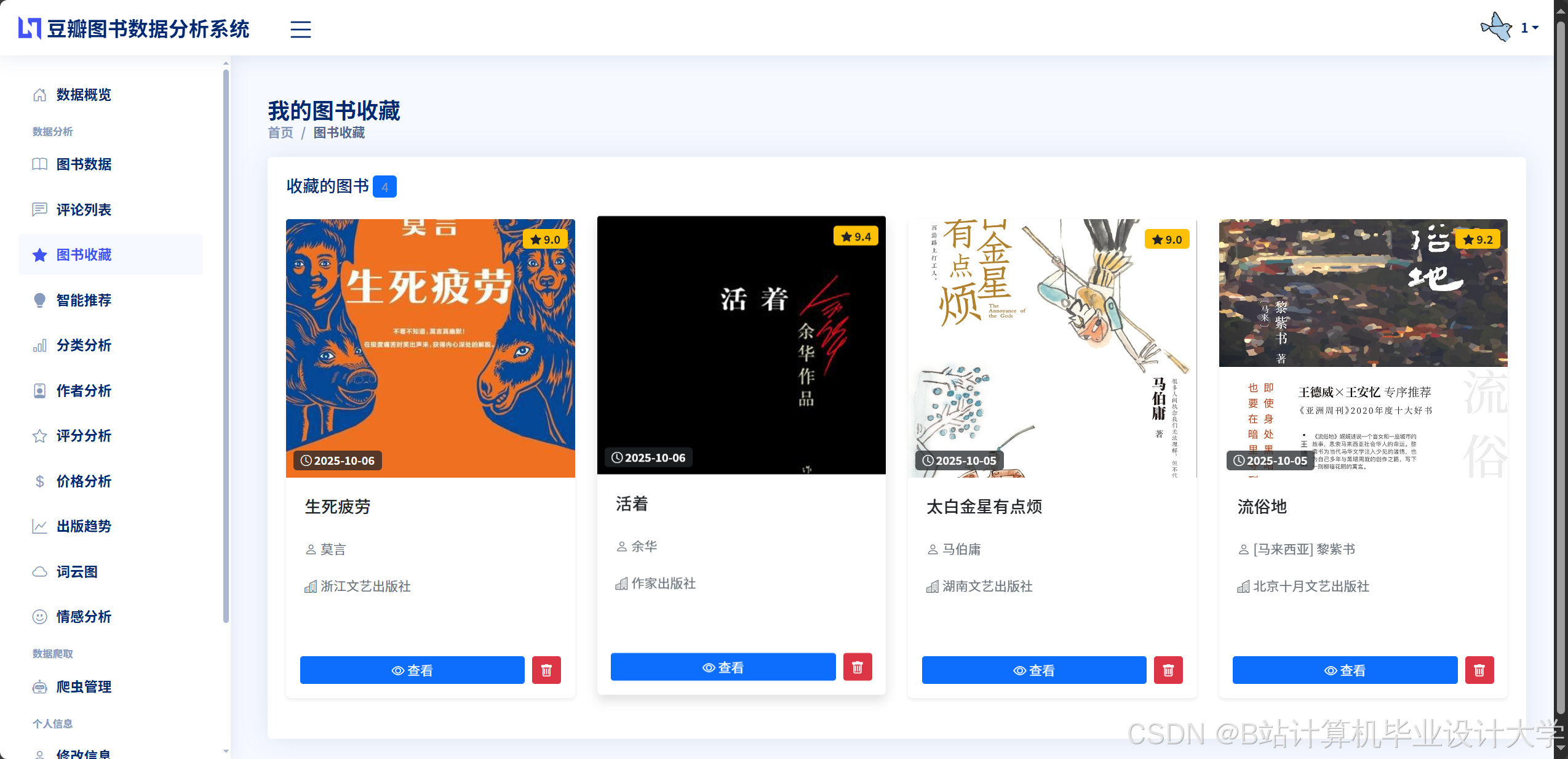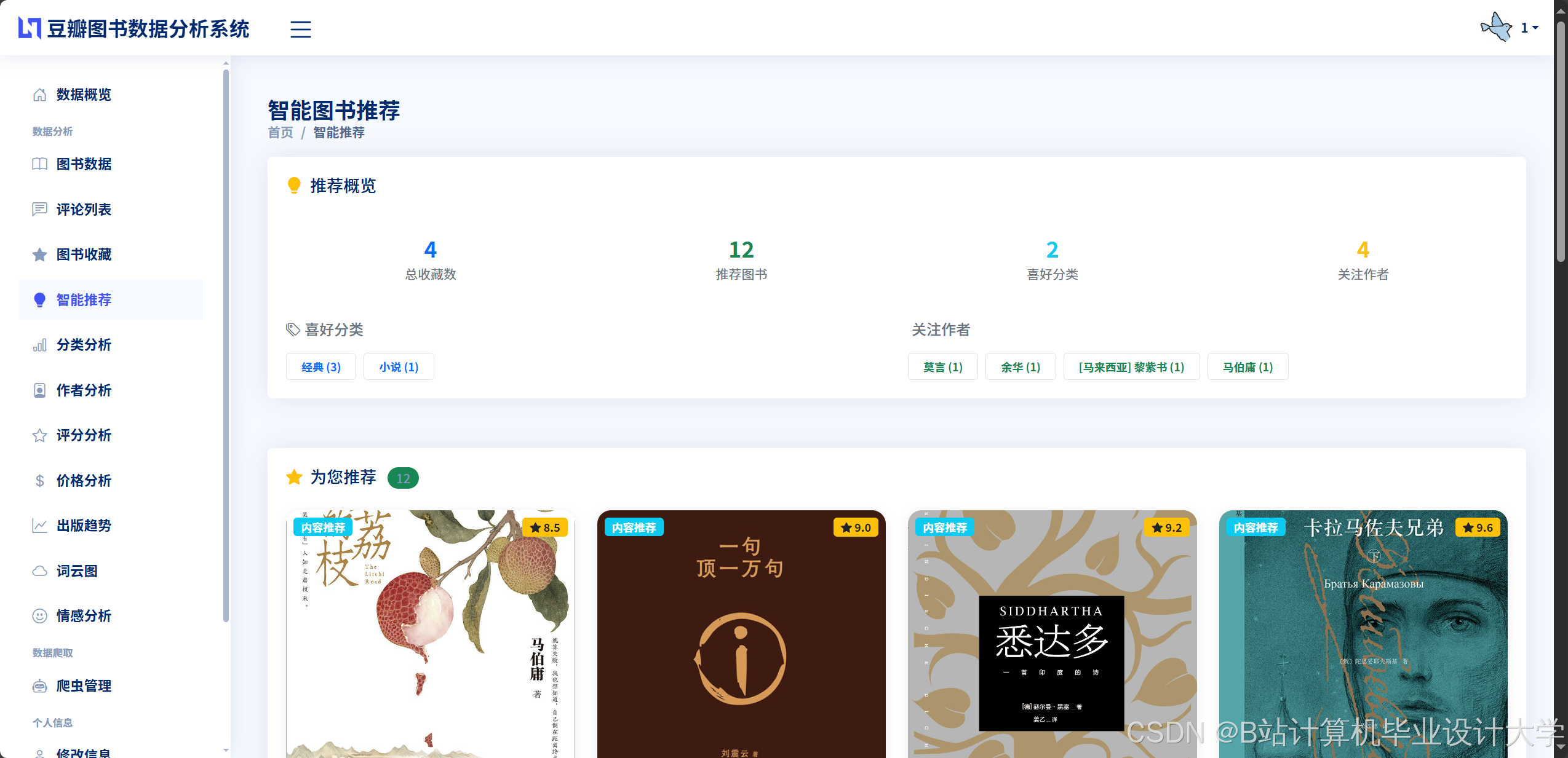 随着互联网图书资源的指数级增长,传统的人工推荐与畅销榜单模式已难以满足用户个性化阅读需求。基于用户行为分析的智能推荐系统成为解决信息过载问题的关键技术。本文以Django+Vue.js技术栈为核心,结合豆瓣图书数据特性,系统梳理了相关领域的研究进展与实践案例,重点分析技术架构、推荐算法及系统功能设计的创新路径。