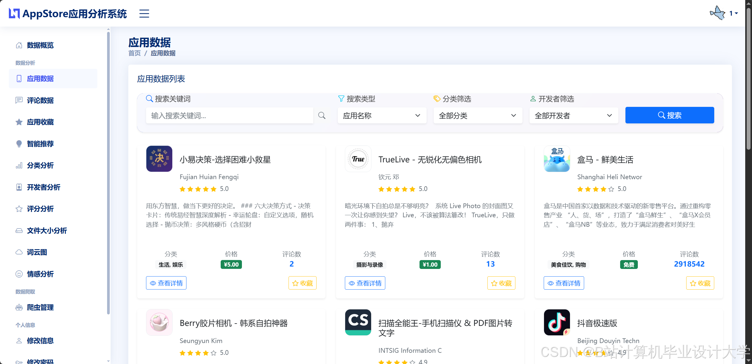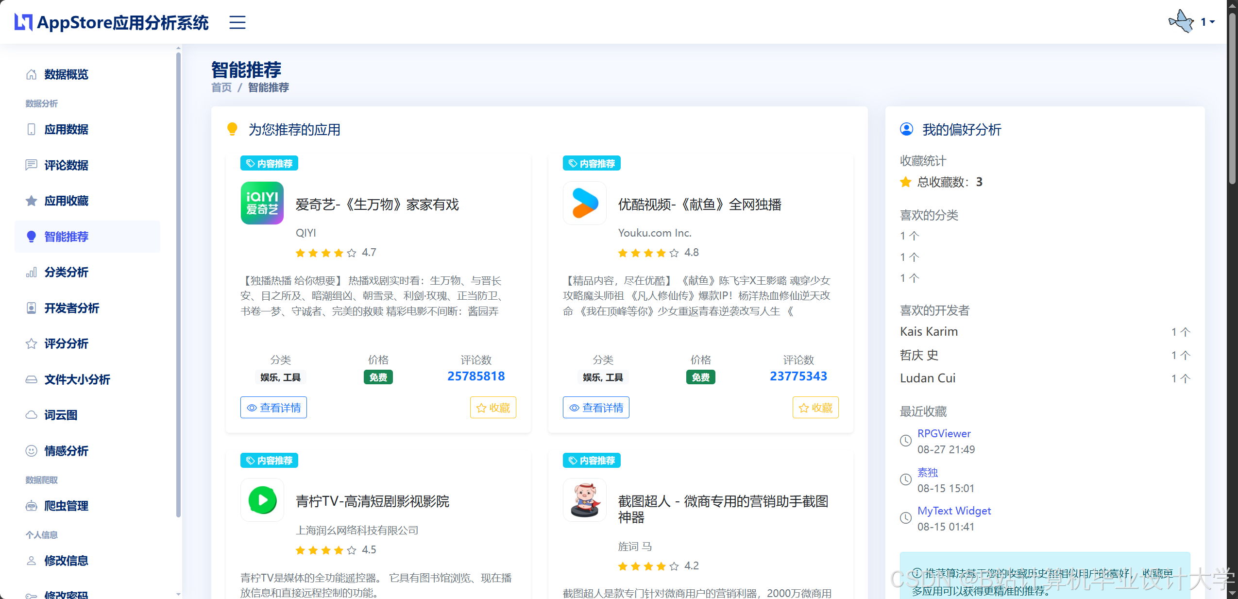- 构建基于Django+Vue.js的Web应用,实现App Store榜单数据的实时采集、可视化展示与个性化推荐。