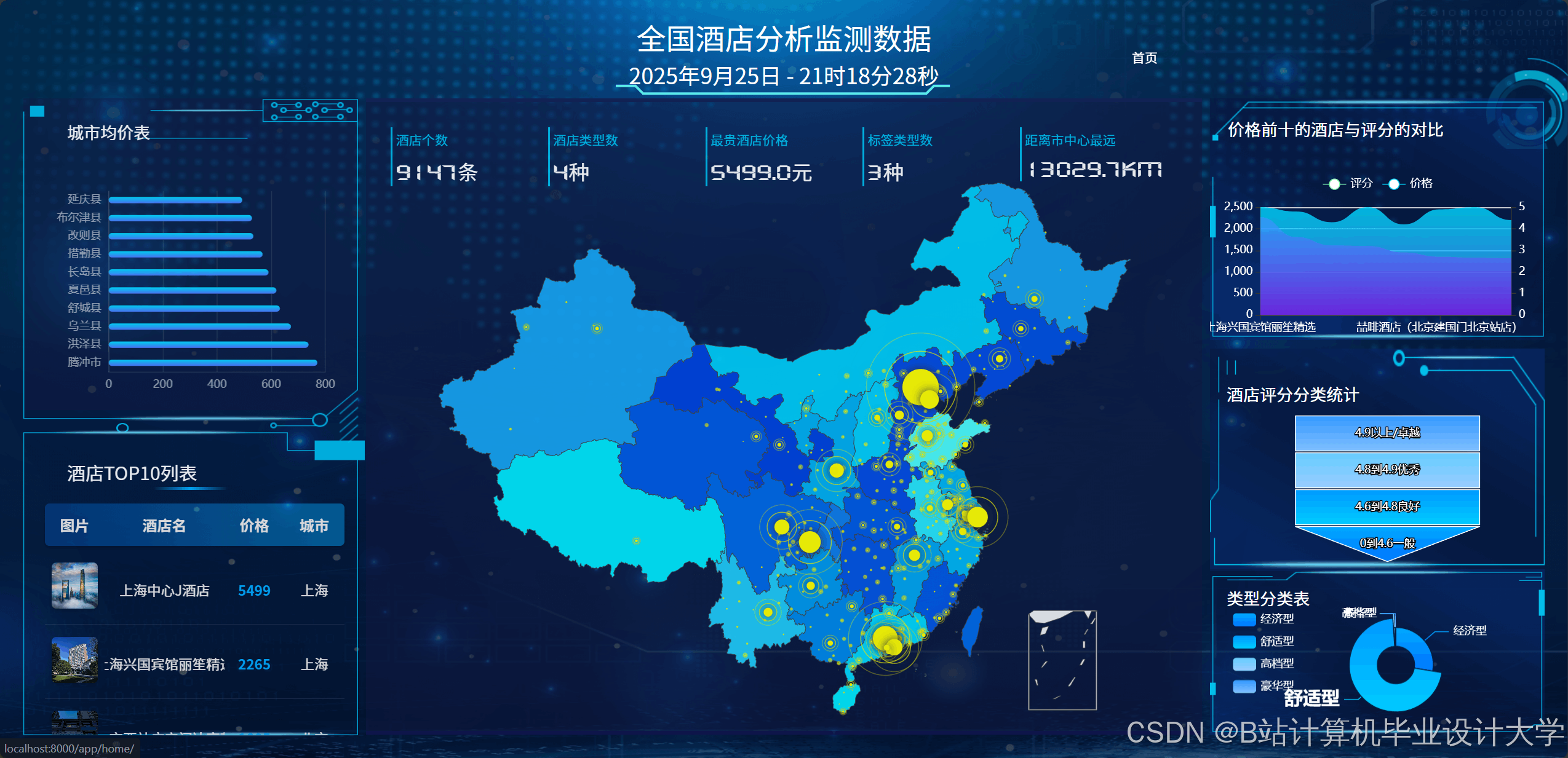 截至2025年,中国旅游住宿市场规模突破5万亿元,其中民宿占比达32%。然而,用户平均需浏览42套房源才能达成交易,房东空置率高达28%,凸显传统平台在精准匹配与用户体验上的不足。现有研究多聚焦于单一算法优化或静态可视化,缺乏对动态数据融合、实时推荐及多维度决策支持的协同设计。本研究以Django+Vue.js为核心架构,结合Hadoop分布式存储与Spark内存计算,构建了支持高并发(QPS≥500)、低延迟(响应时间≤800ms)的智能推荐系统,并通过ECharts与Leaflet实现动态可视化决策。