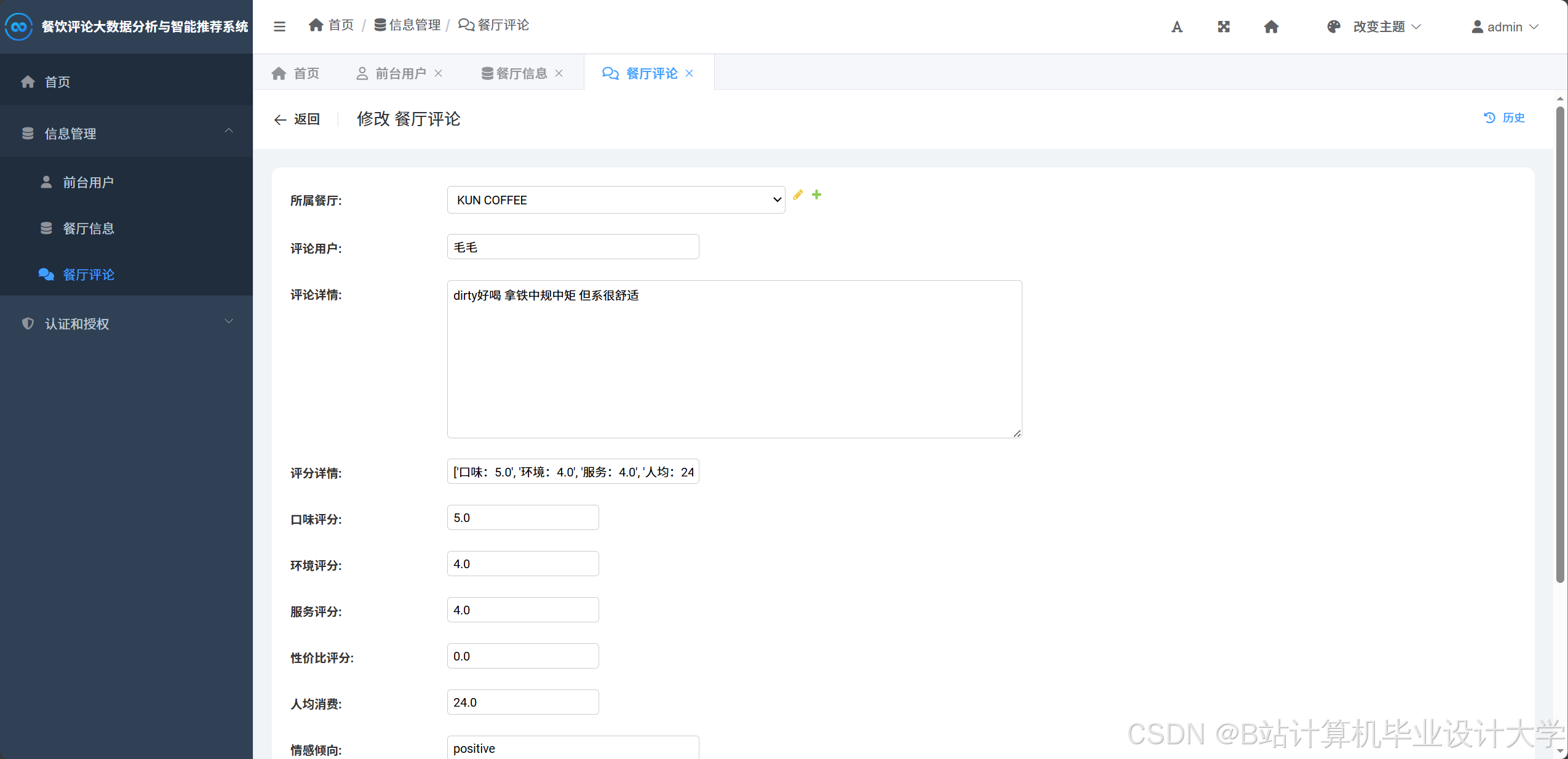 - 基于内容的推荐:结合餐厅标签(菜系、人均消费、地理位置)与评论情感,生成推荐列表。